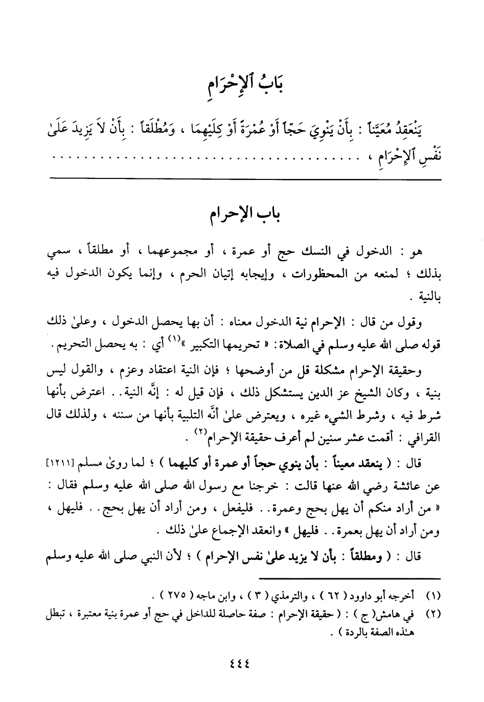 وقول من قال: الإحرام نية الدخول معناه: أن بها يحصل الدخول، وعلى ذلك قوله صلى الله عليه وسلم في الصلاة: (تحريمها التكبير) أي: به يحصل التحريم.