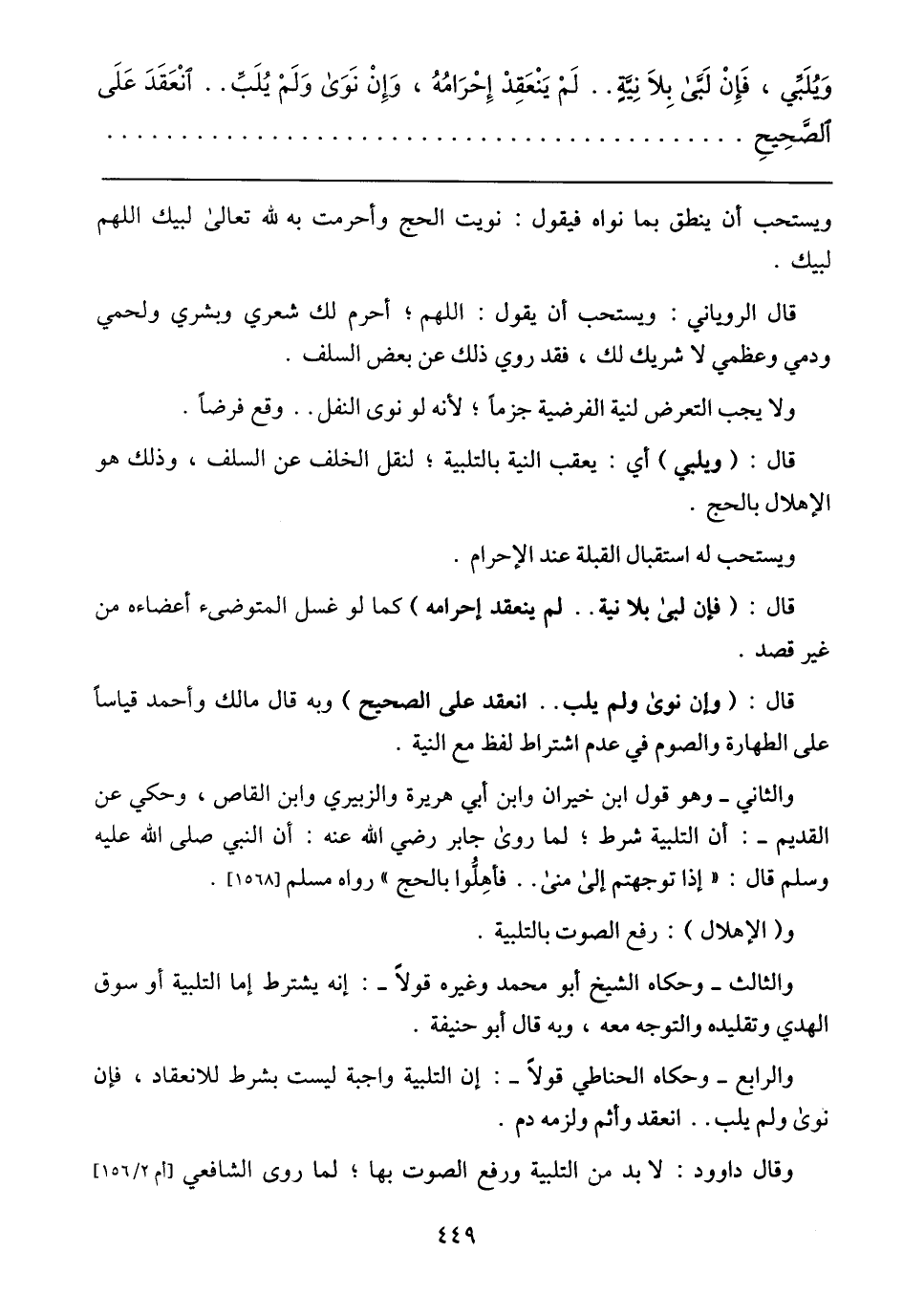 والثاني –وهو قول ابن خيران وابن أبي هريرة والزبيري وابن القاص، وحكي عن القديم-: أن التلبية شرط؛ لما روى جابر رضي الله عنه: أن النبي صلى الله عليه وسلم قال: (إذا توجهتم إلى منى .. فأهلوا بالحج) رواه مسلم [1568].