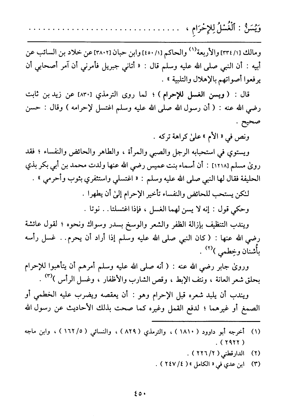 قال: (ويسن الغسل للإحرام)؛ لما روى الترمذي [830] عن زيد بن ثابت رضي الله عنه: (أن رسول الله صلى الله عليه وسلم اغتسل لإحرامه) وقال: حسن صحيح.