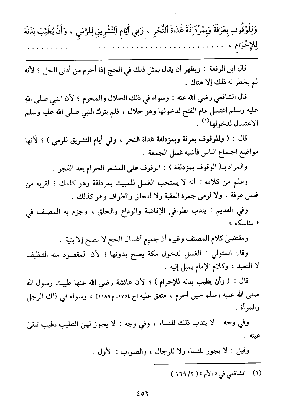 وَلِلْوُقُوفِ بِعَرَفَةَ وَبِمُزْدَلِقَةَ غَدَاَةَ النَّخرِ, وَفِي أَيَّامِ التَّشْرِقِ لِلرَّمْيِ, وَأَنْ يُطَيَّبَ بَدَنَهُ لِلإحْرَام