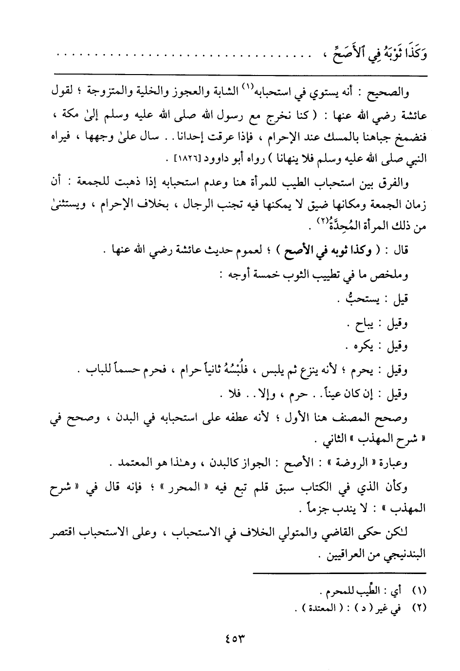 والفرق بين استحباب الطيب للمرأة هنا وعدم استحبابه إذا ذهبت للجمعة: أن زمان الجمعة ومكانها ضيق لا يمكنها فيه تجنب الرجال, بخلاف الإحرام, ويستثنى من ذلك المرأة المُحِدَّةُ.