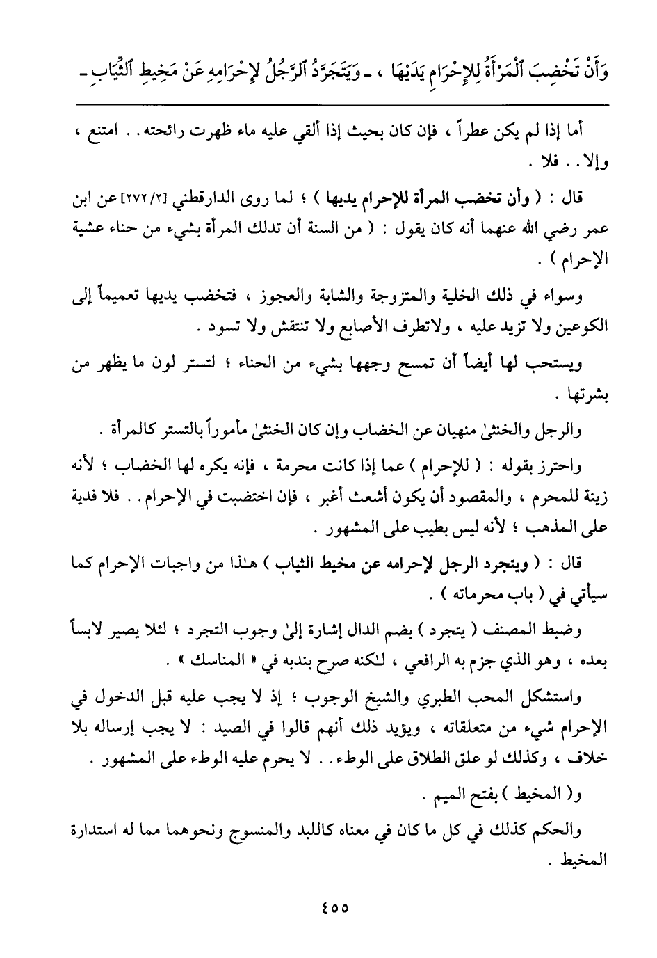 وَأَنْ تَخْضِبَ المَرْأَةُ للِإحْرَامِ يَدَيْهَا, - وَيَتَجَرَّدُ الرَّجُلُ لإِحْرَامِهِ عَنْ مَخِيطِ الثِّيابِ