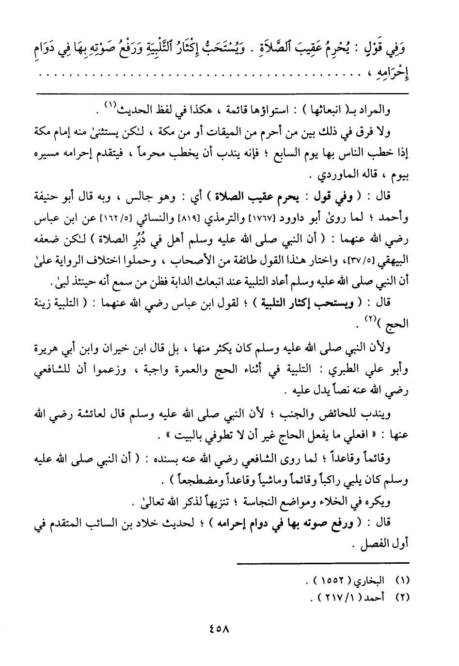 قال: (وفي قول: يحرم عقيب الصلاة) أي: وهو جالس, وبه قال أبو حنيفة وأحمد؛ لما روى أبو داوود [1767] والترمذي [819] والنسائي [5/ 162] عن ابن عباس رضي الله عنهما: (أن النبي صلى الله عليه وسلم أهل في دُبُرِ الصلاة) لكن ضعفه البيهقي [5/ 37] , واختار هذا القول طائفة من الأصحاب, وحملوا اختلاف الرواية علي أن النبي صلى الله عليه وسلم أعاد التلبية عند انبعاث الدابة فظن من سمع أنه حينئذ لبى.