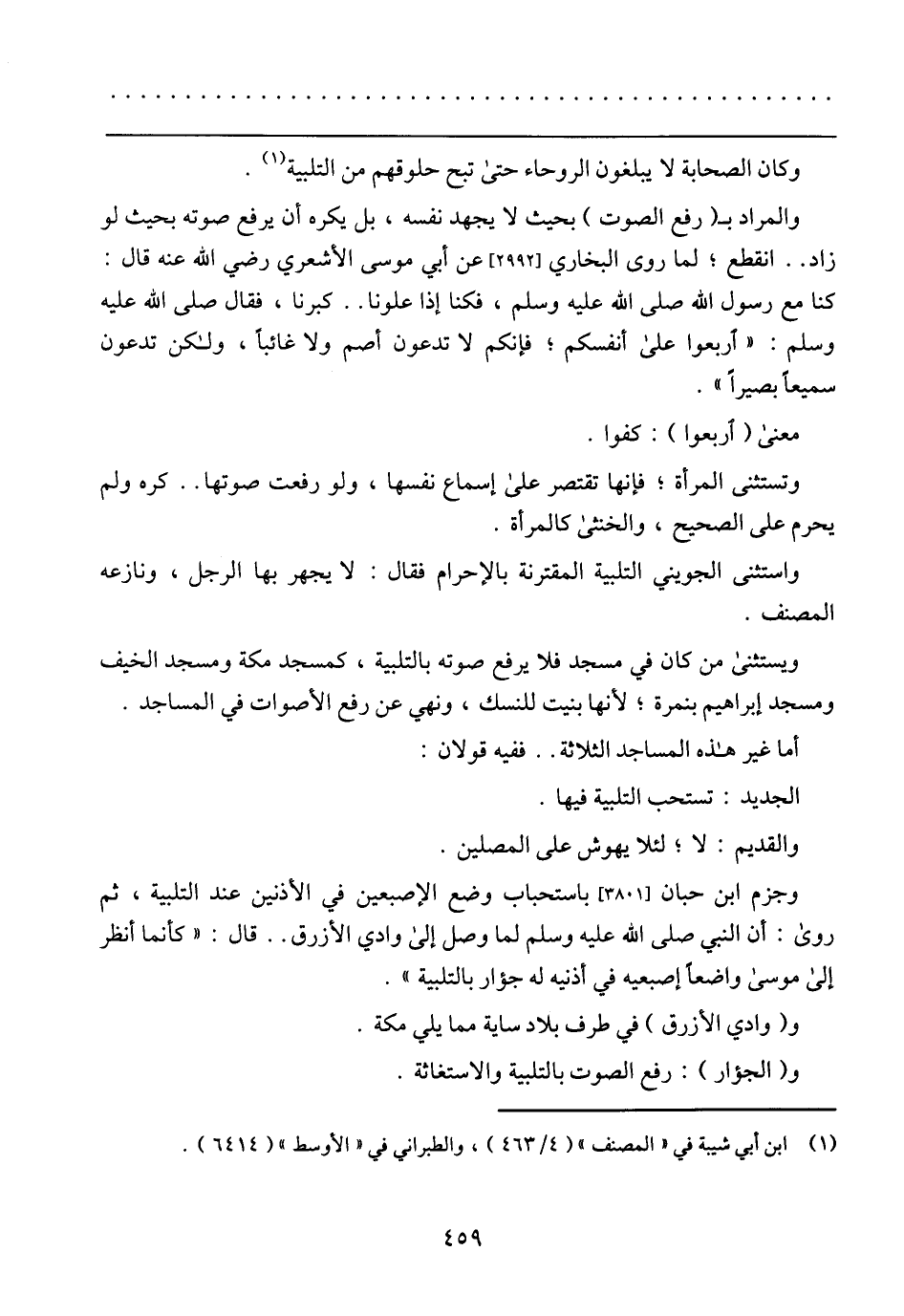 ويستثنى من كان في مسجد فلا يرفع صوته بالتلبية, كمسجد مكة ومسجد الخيف ومسجد إبراهيم بنمرة؛ لأنها بنيت للنسك, ونهي عن رفع الأصوات في المساجد ..