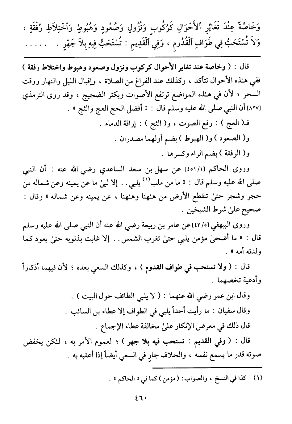 وَخَاصَّةً عِنْدَ تَغَايُرِ الأَحْوَالِ كَرُكُوبِ وَنُزُولٍ وَصُعُودٍ وَهُبُوطٍ وَاخْتِلاَطِ رُفْقَةٍ، وَلاَ تُسْتَحَبُّ فِي طَوَافِ الْقُدُومِ، وَفِي الْقَدِيمِ: تُسْتَحَبُّ فِيهِ بِلاَ جَهْرٍ