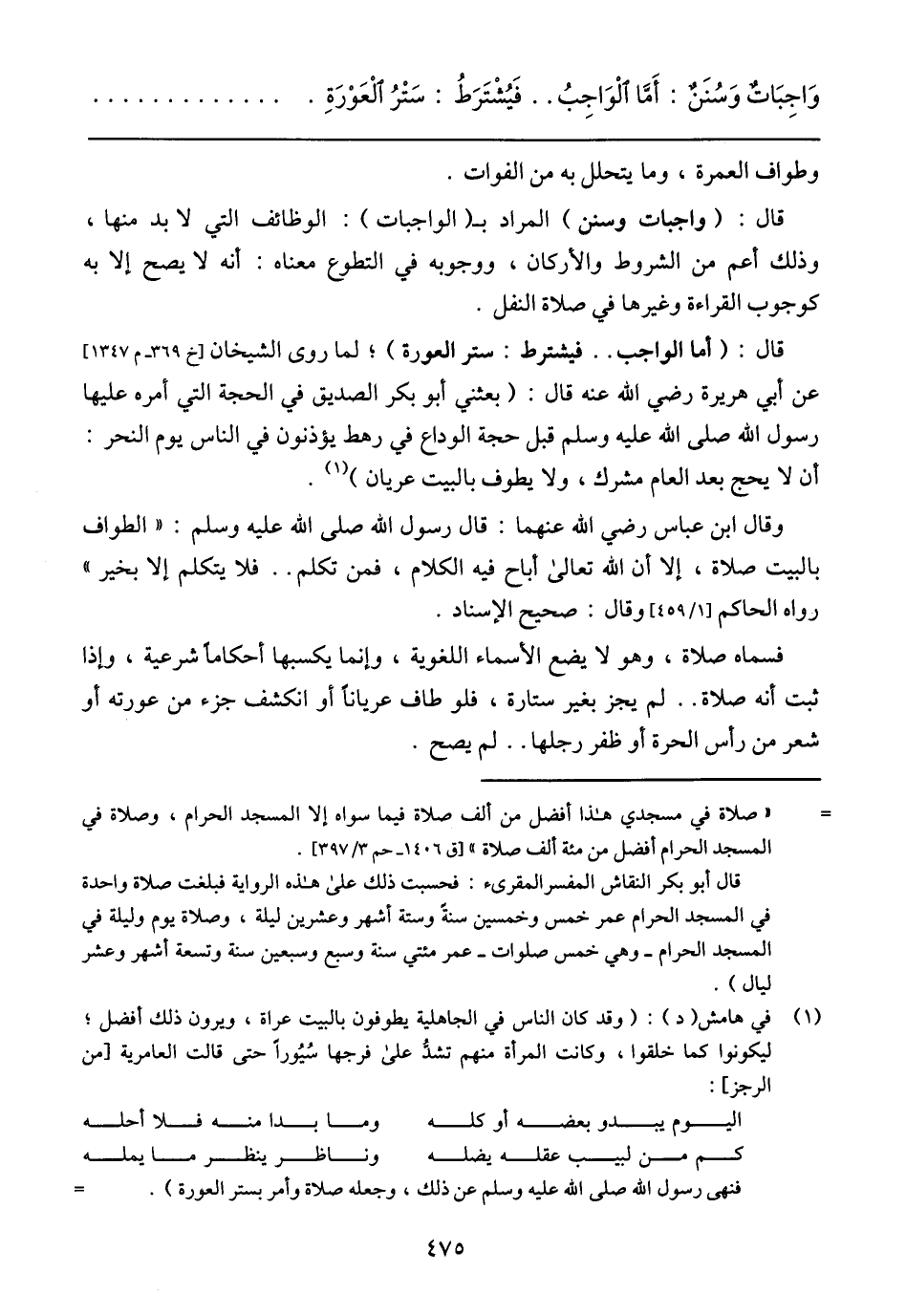 وقال ابن عباس رضي الله عنهما/ قال رسول الله صلى الله عليه وسلم: (الطواف بالبيت صلاة، إلا أن الله تعالى أباح فيه الكلام، فمن تكلم .. فلا يتكلم إلا بخير) رواه الحاكم [1/ 459] وقال: صحيح الإسناد ..