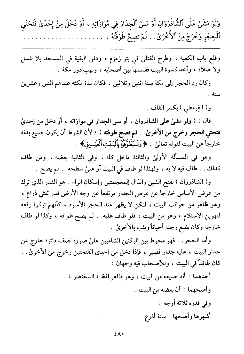 و (الشاذروان) بفتح الشين والذال المعجمتين وإسكان الراء: هو القدر الذي ترك من عرض الأساس خارجًا عن عرض الجدار مرتفعًا عن وجه الأرض قدر ثلثي ذراع، وهو ظاهر من جوانب البيت، لاكن لا يظهر عند الحجر الأسود، كأنهم تركوا رفعه لتهوين الاستلام، وهو من البيت، فلو طاف عليه .. لم يصح طوافه، وكذلك لو طاف خارجه وكان يضع رجله أحيانًا ويثب بالأخرى ..