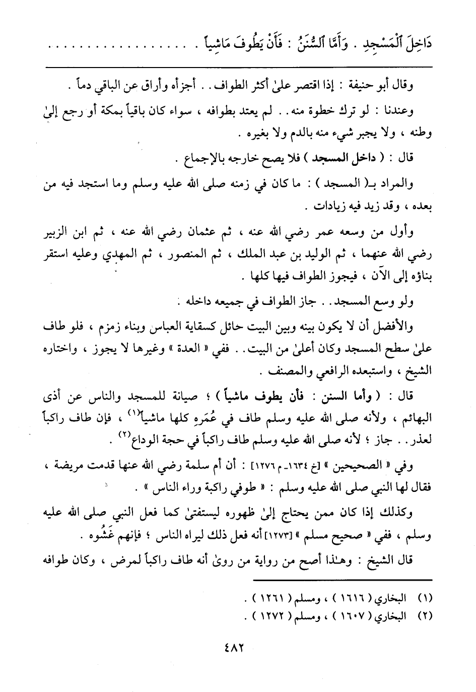 دَاخِلَ الْمَسْجِدِ. وَأَما السنَنُ: فَأَنْ يَطُوفَ مَاشِيًا