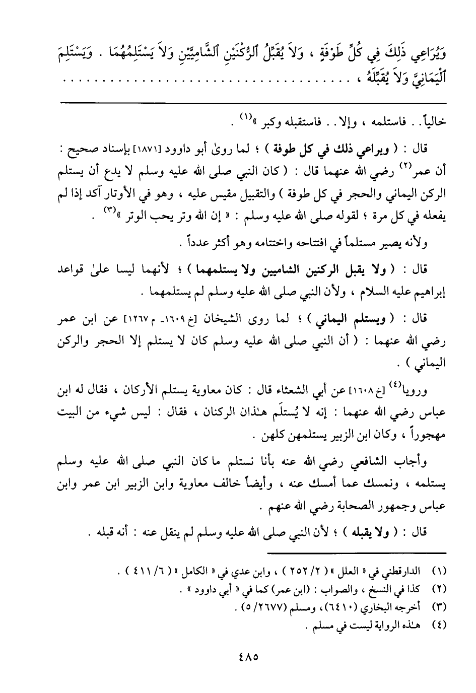 وأجاب الشافعي رضي الله عنه بأنا نستلم ما كان النبي صلى الله عليه وسلم يستلمه، ونمسك عما أمسك عنه، وأيضًا خالف معاوية وابن الزبير ابن عمر وابن عباس وجمهور الصحابة رضي الله عنهم.