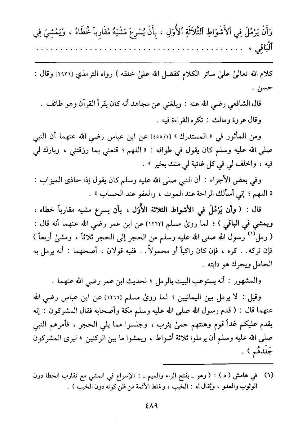 وقيل: لا يرمل بين اليمانيين؛ لما روى مسلم [1266] عن ابن عباس رضي الله عنهما قال: (قدم رسول الله صلى الله عليه وسلم مكة وأصحابه فقال المشركون: إنه صلى الله عليه وسلم أن يرملوا ثلاثة أشواط، ويمشوا ما بين الركبتين؛ ليرى المشركون جَلَدهُم).