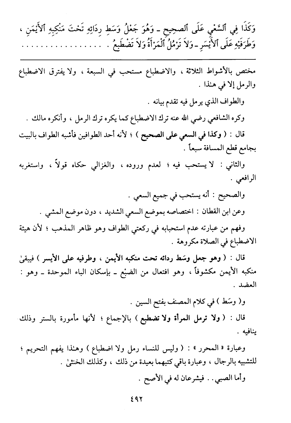 وعبارة (المحرر): (وليس للنساء رمل ولا اضطباع) وهذا يفهم التحريم؛ للتشبيه بالرجال، وعبارة باقي كتبهما بعيدة من ذلك، وكذلك الخنثى.
