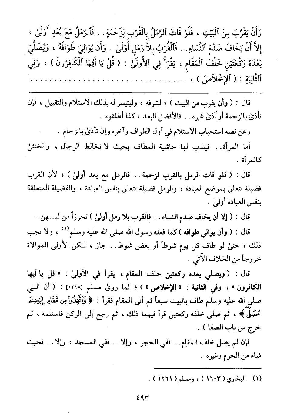 قال: (ويصلي بعده ركعتين خلف المقام، يقرأ في الأولى: {قل يا أيها الكافرون} وفي الثانية (الإخلاص))؛ لما روى مسلم [1218]: (ان النبي صلى الله عليه وسلم طاف بالبيت سبعًا ثم أتى المقام فقرأ: {واتَّخِذُوا مِن مَّقَامِ إبْرَاهِيمَ مُصَلًّى} ثم صلى خلفه ركعتين قرأ فيهما ذلك، ثم رجع إلى الركن فاستلمه، ثم خرج من باب الصفا).