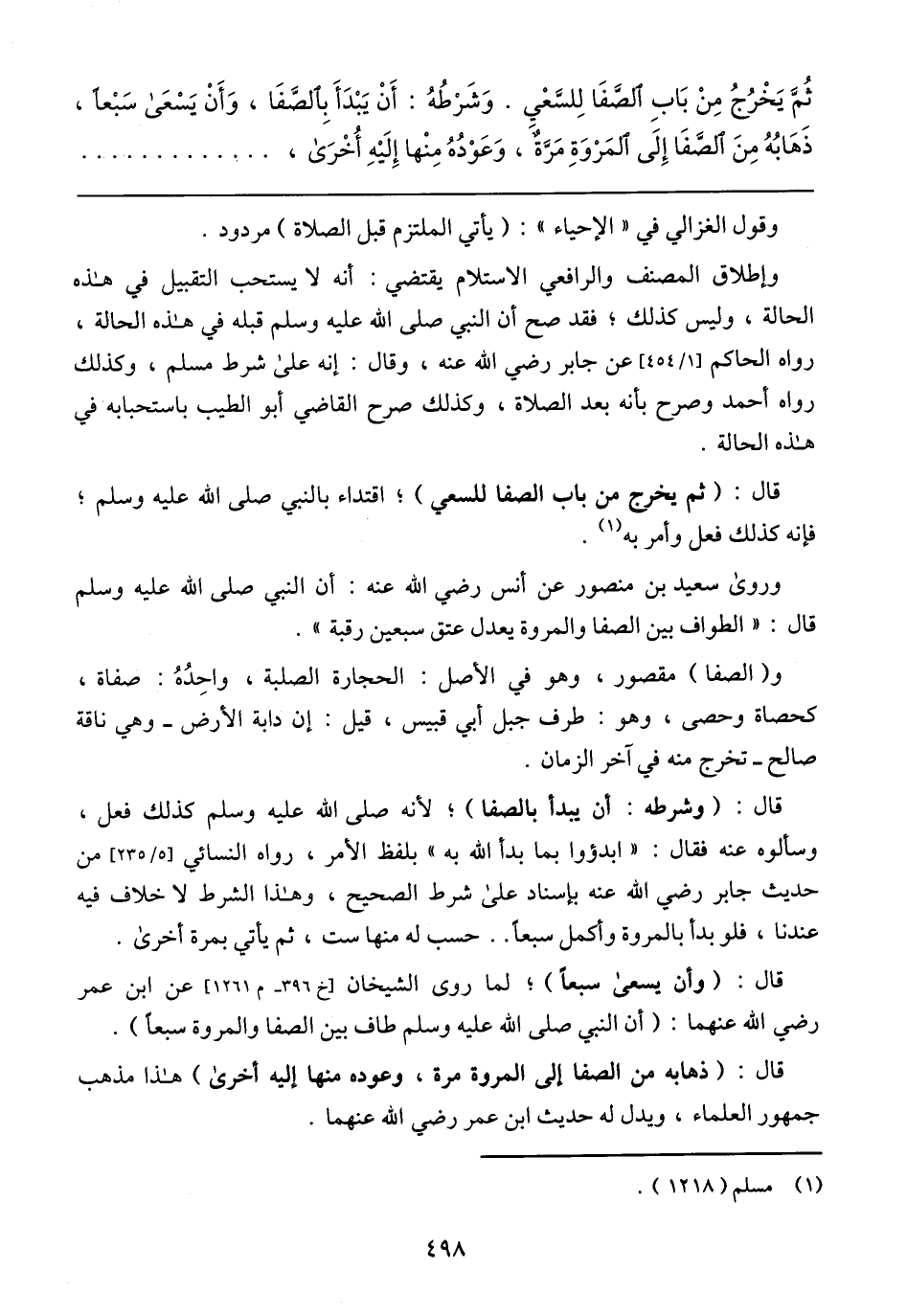 قال: (ذهابه من الصفا إلى المروة مرة، وعوده منها إليه أخرى) هذا مذهب جمهور العلماء، ويدل له حديث ابن عمر رضي الله عنهما.