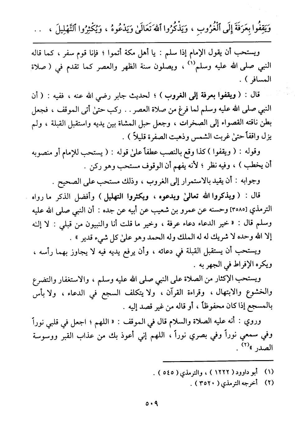 وَيَقِفُوا بِعَرَفَةَ إِلَى الْغُرُوبِ، وَيَذْكُرُوا اللهَ تَعَالَى وَيَدْعُوهُ، وَيُكْثِرُوا التَّهْلِيلَ،