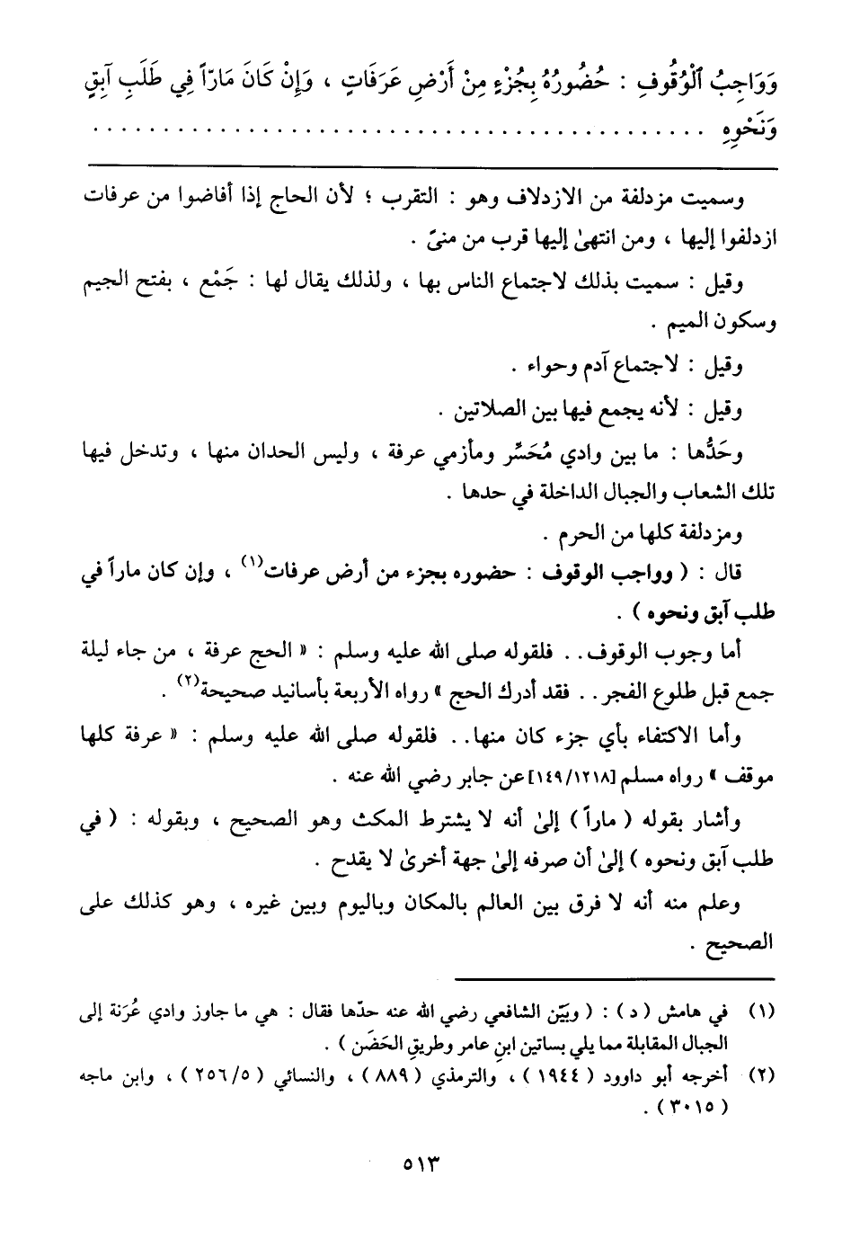 أما وجوب الوقوف .. فلقوله صلى الله عليه وسلم: (الحج عرفة، من جاء ليلة جمع قبل طلوع الفجر .. فقد أدرك الحج) رواه الأربعة بأسانيد صحيحة.