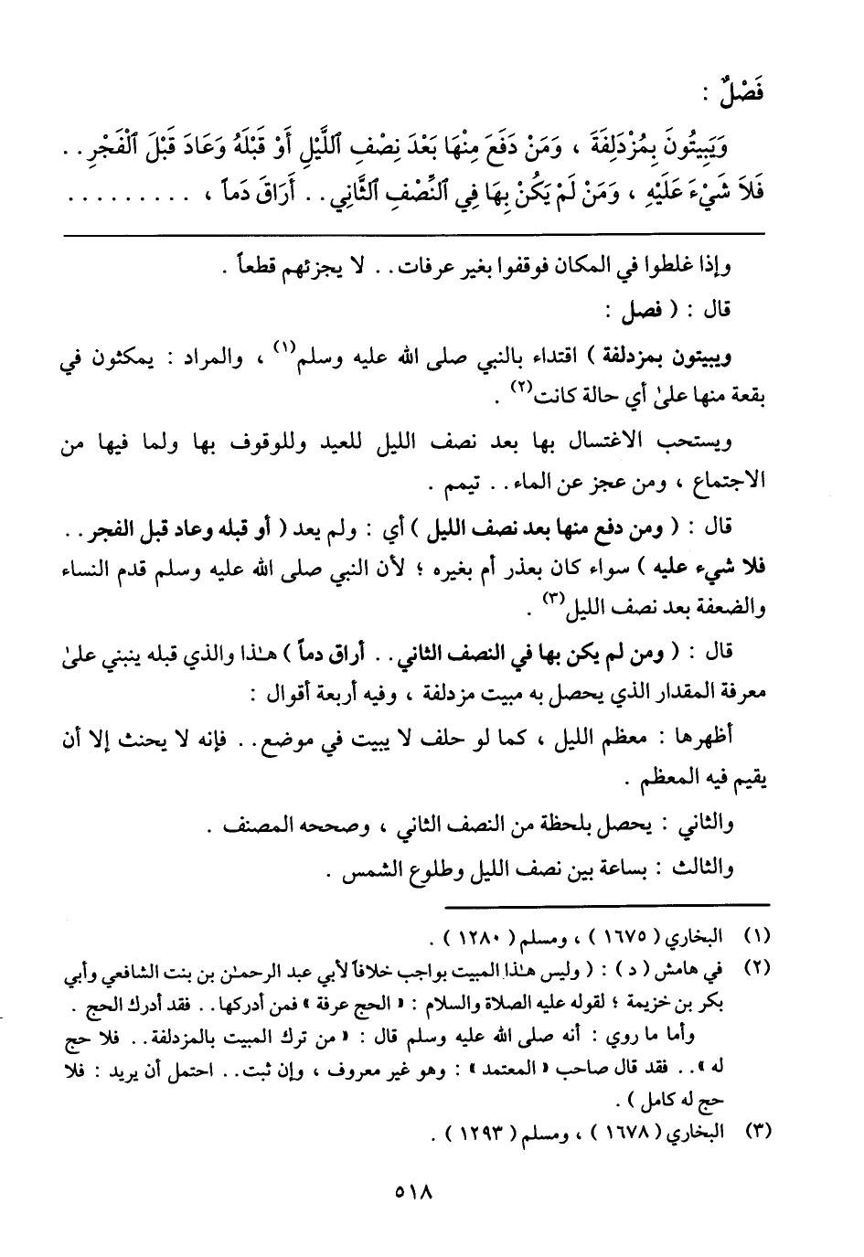 وَيَبِيتُونَ بِمُزْدَلِفَةَ، وَمَنْ دَفَعَ مِنْهَا بَعْدَ نِصْفِ اللَّيْلِ أَوْ قَبْلَهُ وَعَادَ قَبْلَ الْفَجْرِ .. فَلَا شَيْءَ عَلَيْهِ، وَمَنْ لَمْ يَكُنْ بِهَا فِي النِّصْفِ الثَّانِي .. أَرَاقَ دَمًا،