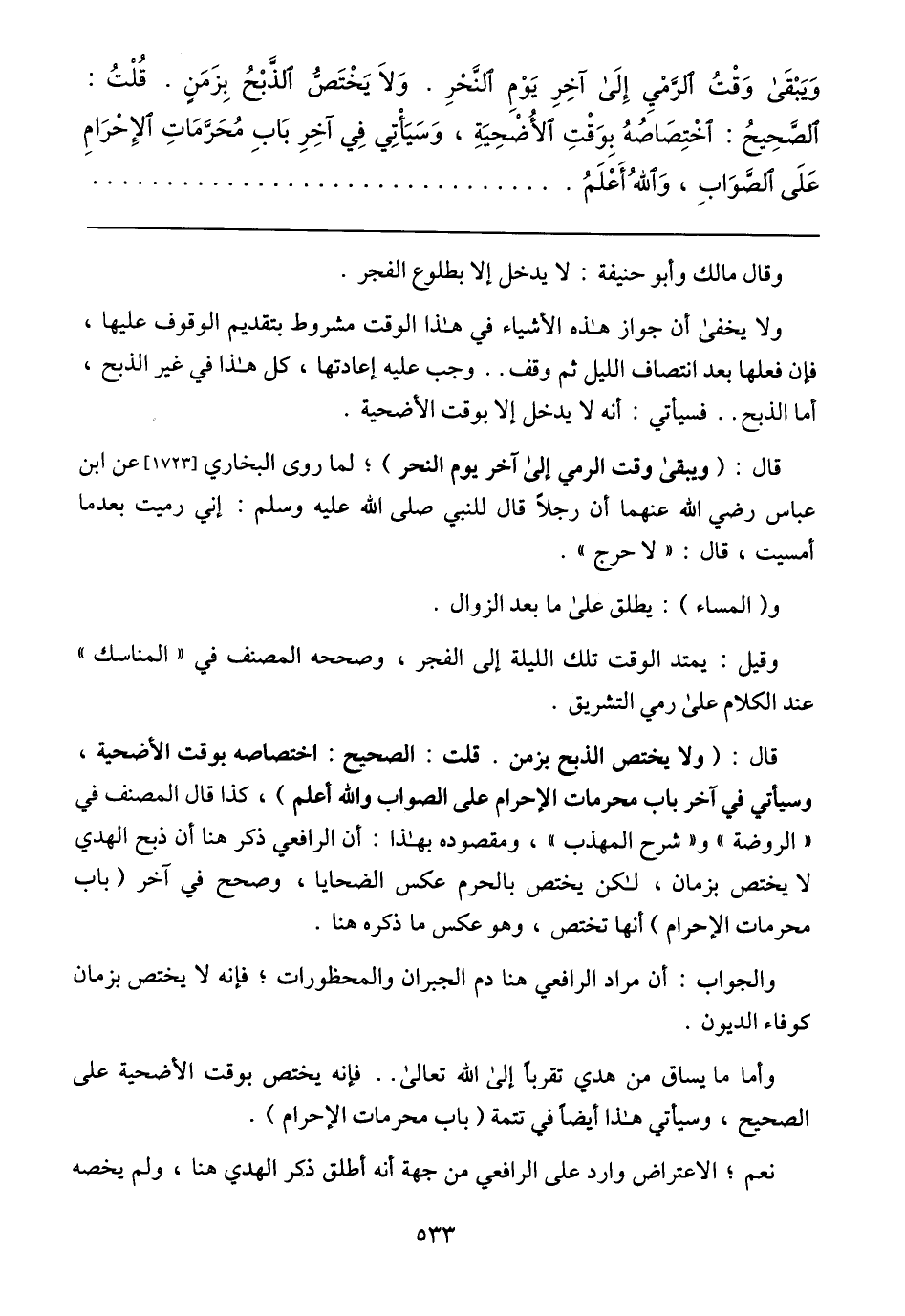 وَيبقَى وَقتُ الرَّميِ إلَى آخِرِ يَومِ النَّحرِ. وَلاَ يَختَصُّ الذَّبحُ بِزَمَنٍ. قُلتُ: الصَّحِيحُ: اخِتصَاصُهُ بِوَقتِ الأُضحِيَةِ, وَسَيَأتِي فِي آخِرِ بَابٍ مُحَرَّمَاتِ الإحرَامِ عَلَى الصَّوَابِ, واللُه أعلَمُ