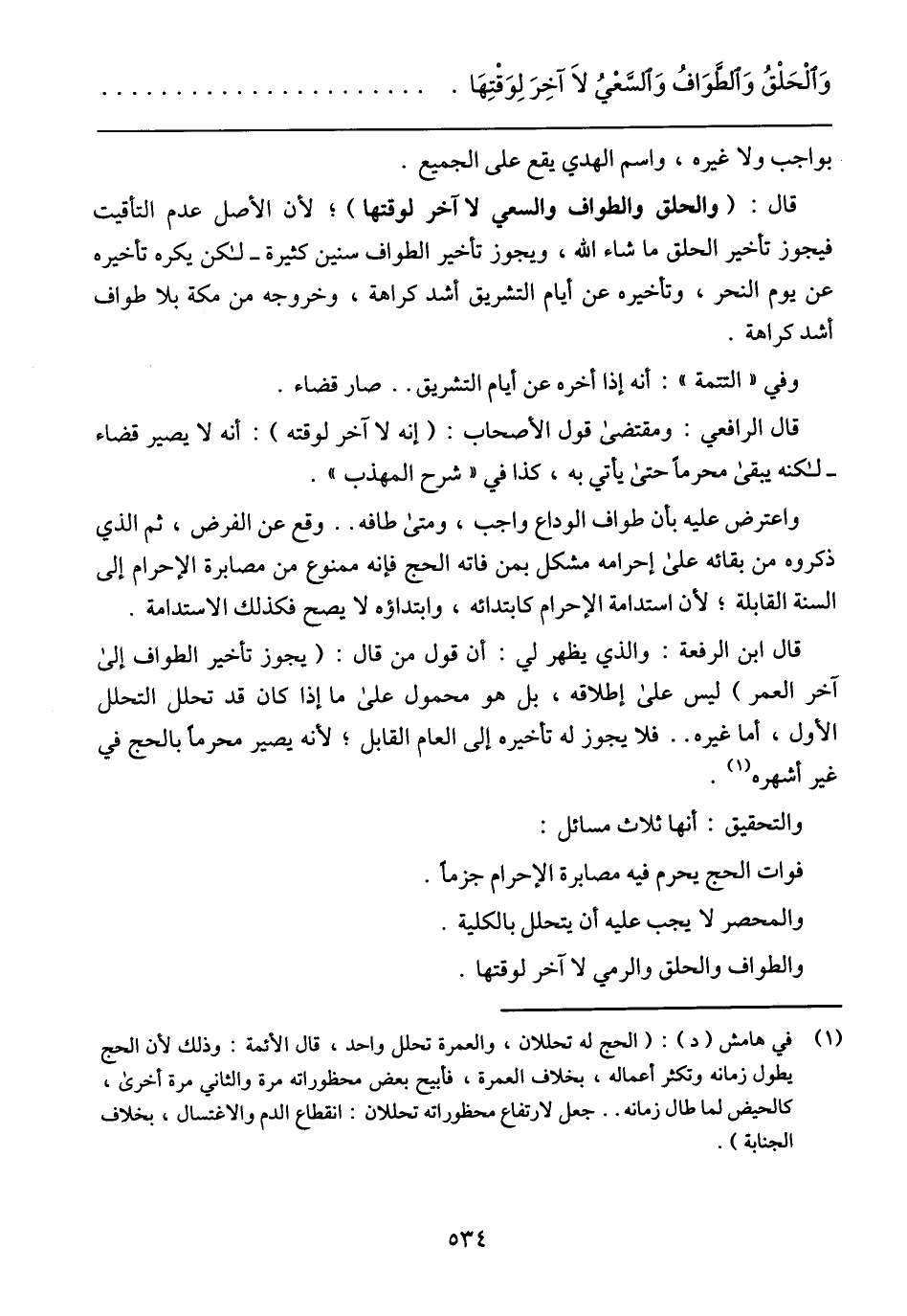 قال ابن الرافعة: والذي يظهر لي: أن قول من قال: (يجوز تأخير الطواف إلى آخر العمر) ليس على إطلاقه, بل هو محمول على ما إذا كان قد تحلل التحلل الأول, وأما غيره .. فلا يجوز له تأخير إلى العام القابل؛ لأنه يصير محرمًا بالحج في غير أشهره.
