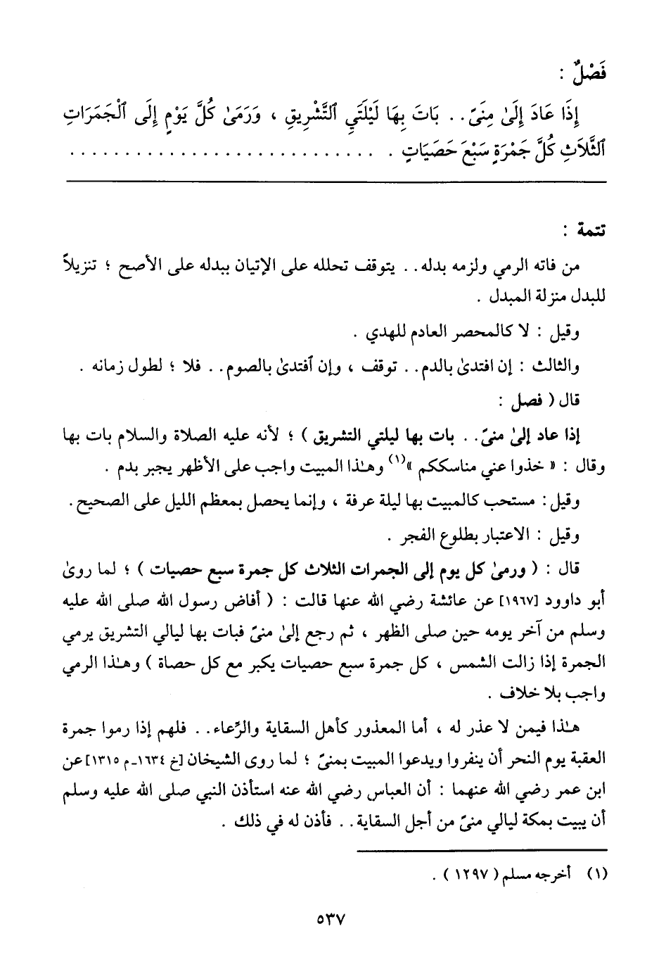 هذا فيمن لا عذر له, أما المعذور كأهل السقاية والرعاء .. فلهم إذا رموا جمرة العقبة يوم النحر أن ينفروا ويدعوا المبيت بمنى؛ لما روى الشيخان [خ 1634_ م 1315] عن ابن عمر رضي الله عنهما: أن العباس رضي الله عنه استأذن النبي صلى الله عليه وسلم أن يبيت بمكة ليالي منى من أجل السقاية .. فأذن له في ذلك.
