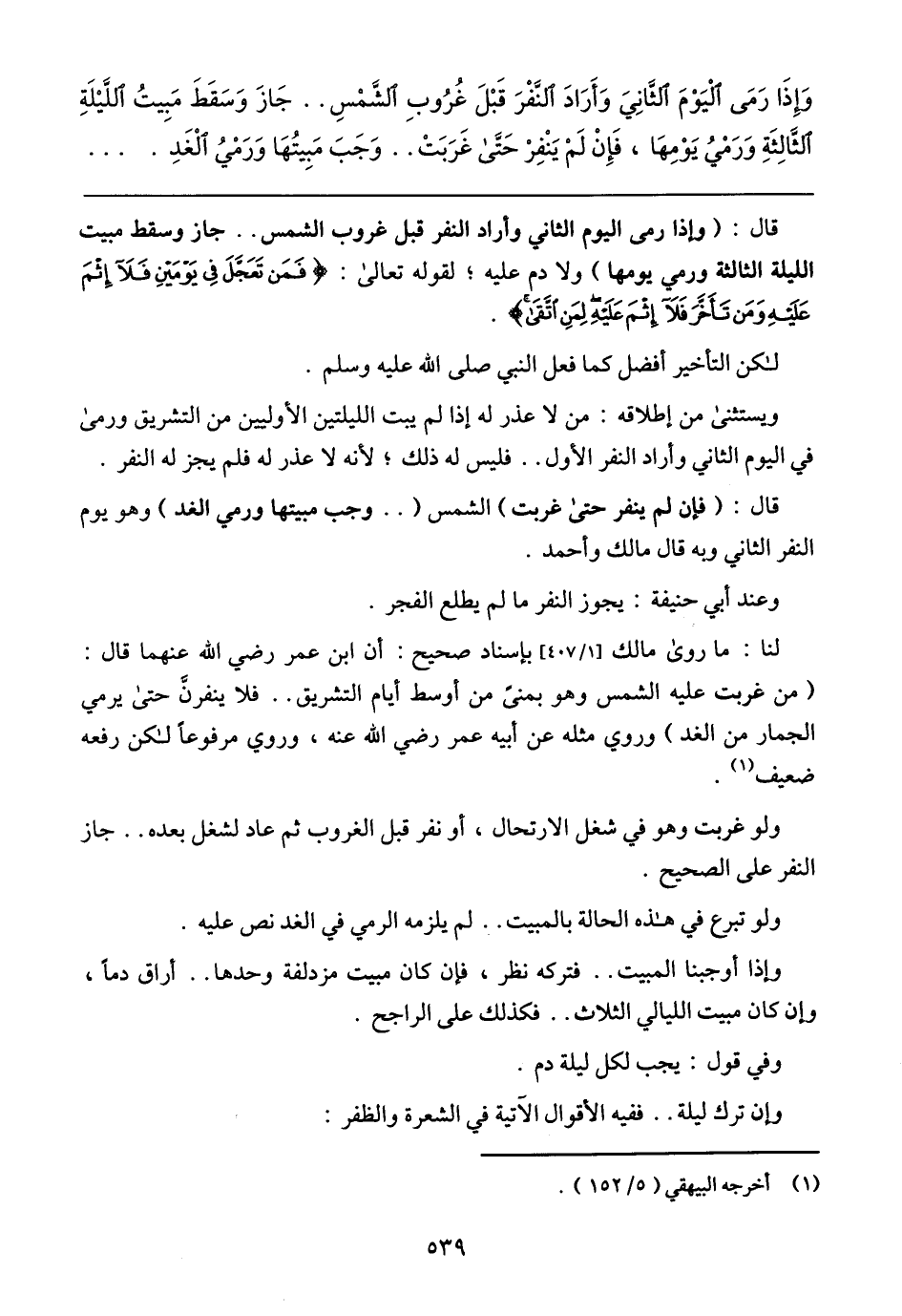 وَإذَا رَمَى اليَومَ الثَّانِي وَأرَادَ النَّفرَ قَبلَ غُرُوبِ الشَّمسِ .. جَازَ وَسَقَطَ مَبِيتُ اللَّيلَةِ الثَّالِثَةِ وَرَمَى يَومِهَا, فَإن لَم يَنفِر حَتَّى غَرَبَت .. وَجَبَ مَبِيتُهَا وَرَمى الغَّدِ