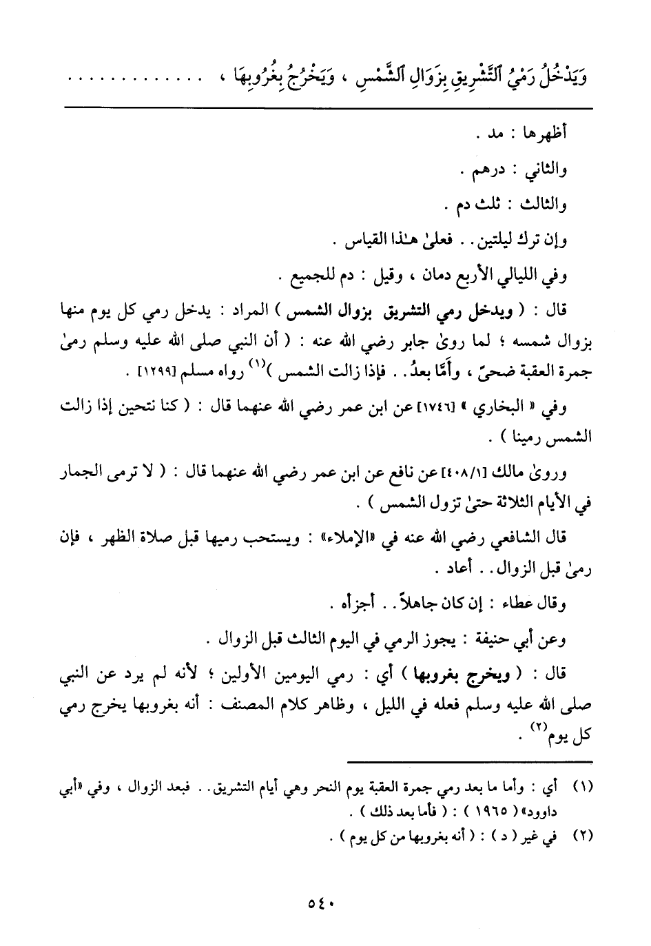 وروى مالك [1/ 408] عن نافع ابن عمر رضي الله عنهما قال: (لا ترمى الجمار في الأيام الثلاثة حتى تزول الشمس).