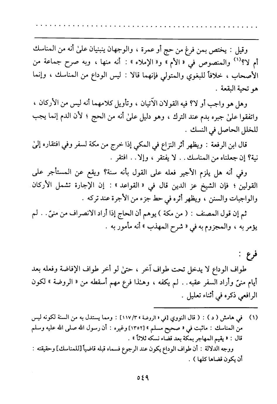 وقيل: يختص بمن فرغ من حج أو عمرة، والوجهان ينبنيان على أنه من المناسك أم لا؟ والمنصوص في (الأم) و (الإملاء (: أنه منها، وبه صرح جماعة من الأصحاب، خلافًا للبغوي والمتولي فإنهما قالا: ليس الوداع من المناسك، وإنما هو تحية البقعة.