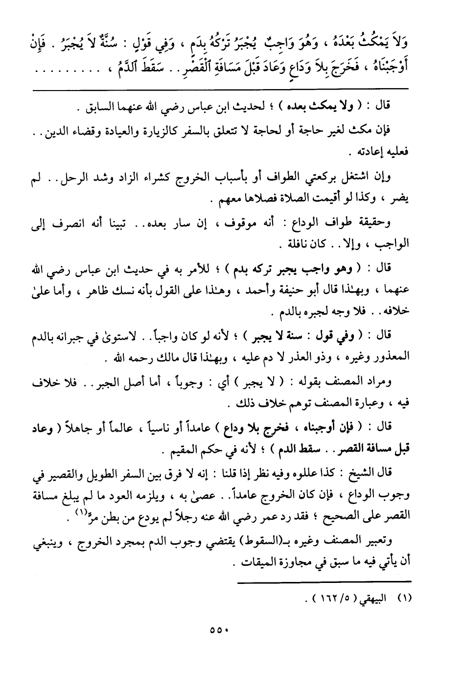 قال: (وهو واجب يجبر تركه بدم)؛ للأمر به في حديث ابن عباس رضي الله عنهما، وبهذا قال أبو حنيفة وأحمد، وهذا على القول بأنه نسك ظاهر، وأما على خلافه .. فلا وجه لجبره بالدم.