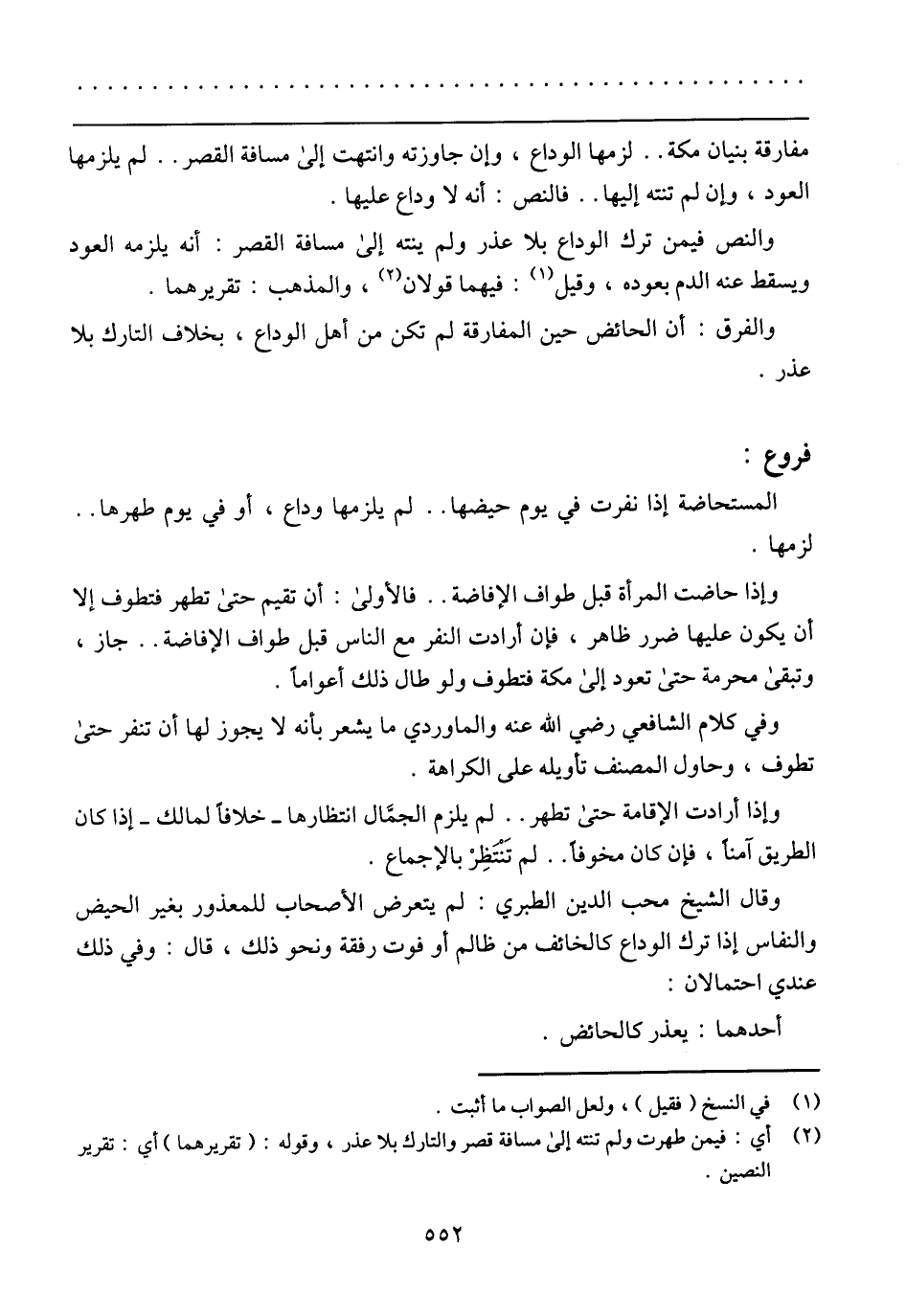 وقال الشيخ محب الدين الطبري: لم يتعرض الأصحاب للمعذور بغير الحيض والنفاس إذ ترك الوداع كالخائف من ظالم أو فوت رفقة ونحو ذلكن قال: وفي ذلك عندي احتمالان: