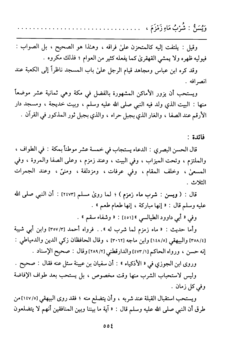 ويستحب أن يزور الأماكن المشهورة بالفضل في مكة وهي ثمانية عشر موضعًا منها: البيت الذي ولد فيه النبي صلى الله عليه وسلم، وبيت خديجة، ومسجد دار الأرقم عند الصفا، والغار الذي بجبل حراء، والذي يجبل ثور المذكور في القرآن.