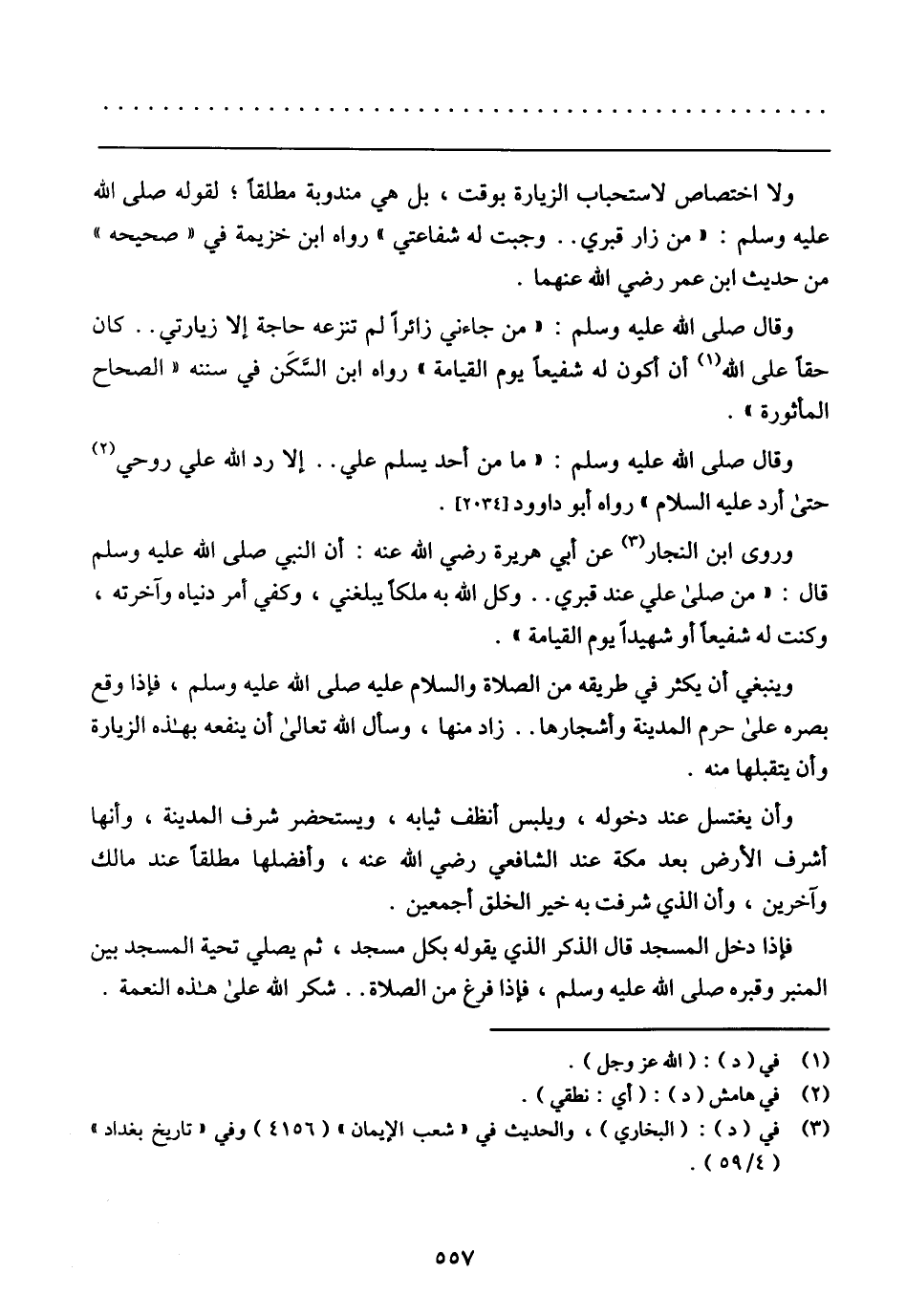 ولا اختصاص لا ستجاب الزيارة بوقت، بل هي مندوبة مطلقًا؛ لقوله صلى الله عليه وسلم: (من زار قبري .. وجبت له شفاعتي) رواه ابن خزيمة في (صحيحه) من حيث ابن عمر رضي الله عنهما.