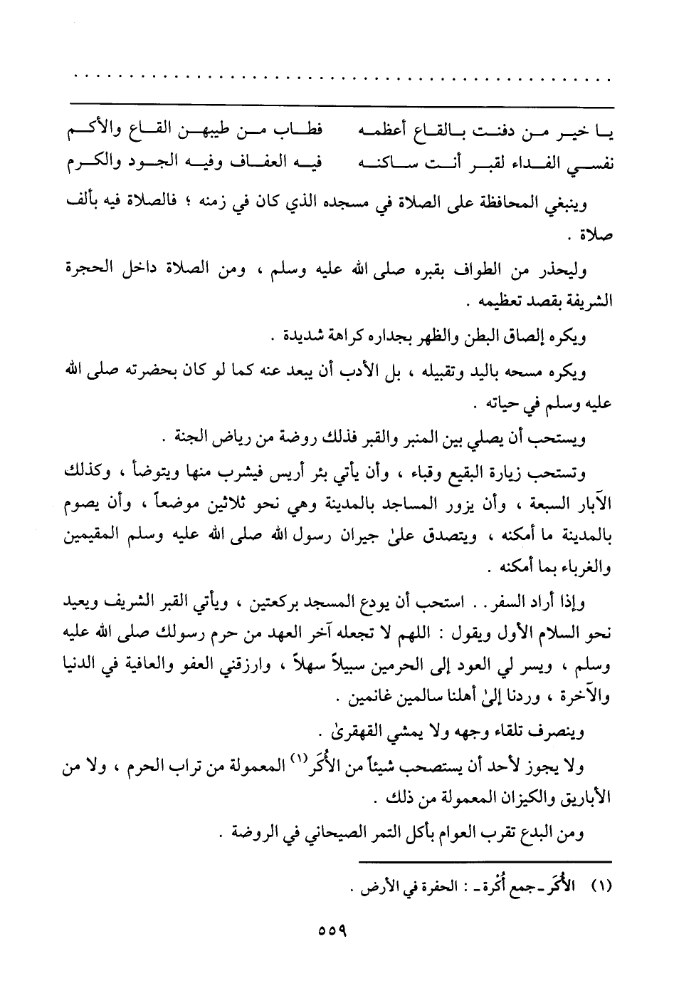 وأن يزور المساجد بالمدينة وهي نحو ثلاثين موضعًا، وأن يصوم بالمدينة ما أمكنه، ويتصدق على