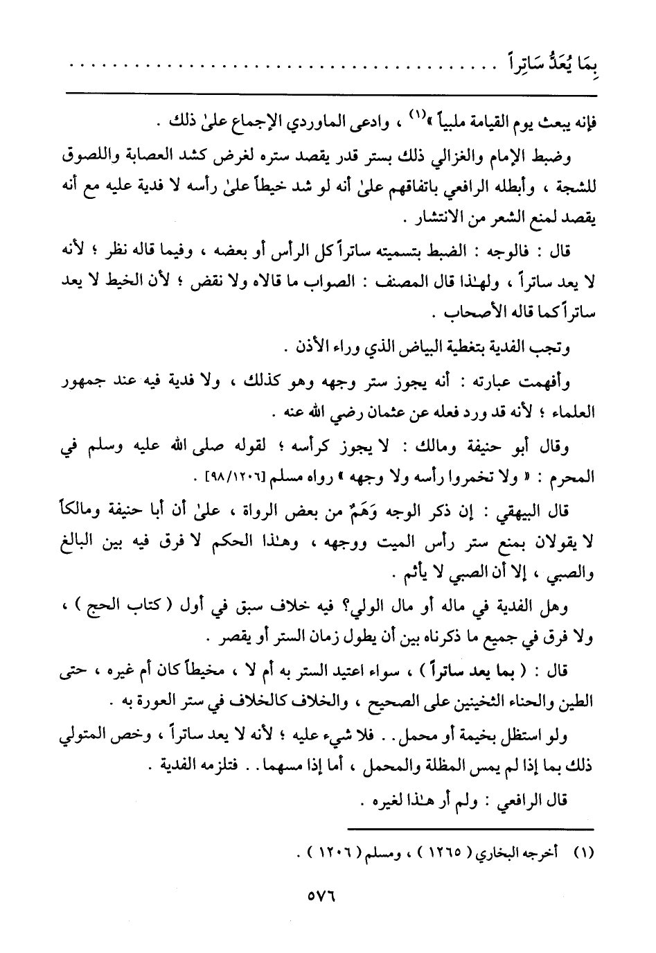 وضبط الإمام والغزالي ذلك بستر قدر يقصد ستره لغرض كشد العصابة واللصوق للشجة، وأبطله الرافعي باتفاقهم على أنه لو شد خيطًا على رأسه لا فدية عليه مع أنه يقصد لمنع الشعر من الإنتشار.