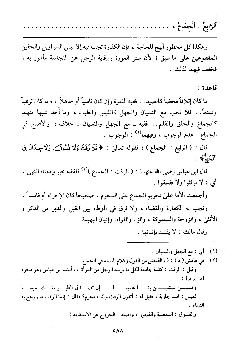 قال: (الرابع: الجماع)؛ لقوله تعالى: {فَلَا رَفَثَ وَلَا فُسُوقَ وَلَا جِدَالَ فِي الْحَجِّ}.