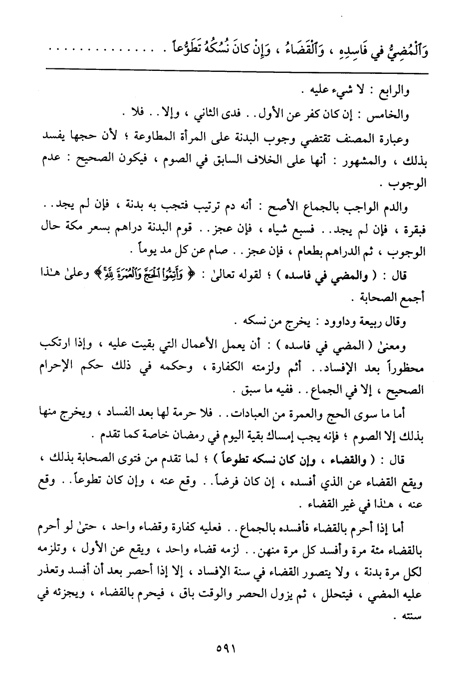 ومعنى (المضي في فاسده): أن يعمل الأعمال التي بقيت عليه، وإذا ارتكب محظورًا بعد الإفساد .. أثم ولزمته الكفارة، وحكمه في ذلك حكم الإجرام الصحيح، إلا في الجماع .. ففيه ما سبق.