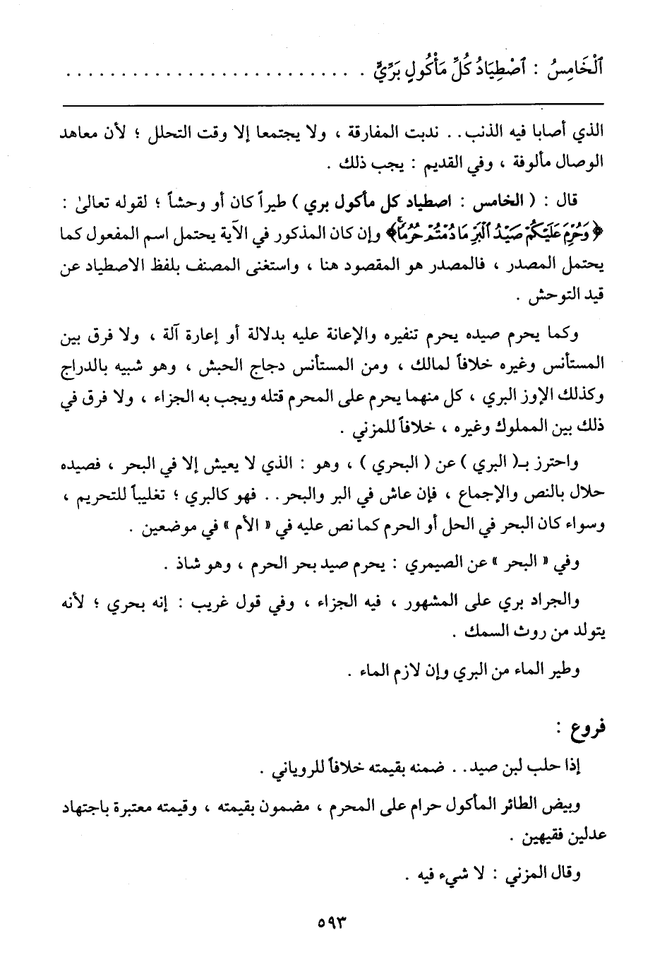 واحترز بـ (البري) عن (البحري)، وهو: الذي لا يعيش إلا في البحر، فصيده حلال بالنص والإجماع، فإن عاش في البر والبحر .. فهو كالبري؛ تغليبًا للتحريم؛ وسواء كان البحر في الحل أو الحرم كما نص عليه في (الأم) في موضعين.