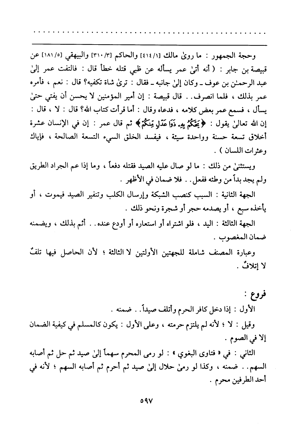 وجهة الجمهور: ما روى مالك [1/ 414] والحاكم [3/ 310] والبيهقى [5/ 181] عن قبيصة بن جابر: (أنه أتى عمر يسأله عن ظبى قتله خطأ قال: فالتفت عمر إلى عبد الرحمن بن عوف ـ وكان إلى جانبه ـ فقال: ترى شاه تكيفه؟ قال: نعم، فأمره عمر بذلك، فلما انصرف .. قال قبيصة: إن أمير المؤمنين لا يحسن أن يفتى حتى يسأل، فسمع عمر بعض كلامه، فدعاه وقال: أما قرأت كتاب الله؟ قال: لا، قال إن الله تعالى يقول: {يَحْكُمُ بِهِ ذَوَا عَدْلٍ مِنْكُمْ} ثم قال عمر: إن فى الإنسان عشرة أخلاق تسعة حسنة وواحدة سيئة، فيفسد الخلق الساء التسعة الصالحة، فإياك وعثرات اللسان).