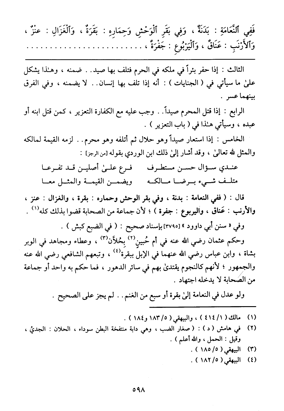 وحكم عثمان رضى الله عنه فى أم حبين بحلان، وعطاء ومجاهد فى الوبر بشاة، ابن عباس رضى الله عنهما فى الإبل ببقرة، وتبعهم الشافعى رضى الله عنه والجمهور، لأنهم كالنجوم يقتدى بهم فى سائر الدهور، فما حكم به واحد او جماعة من الصحابة لا يدخله اجتهاد.