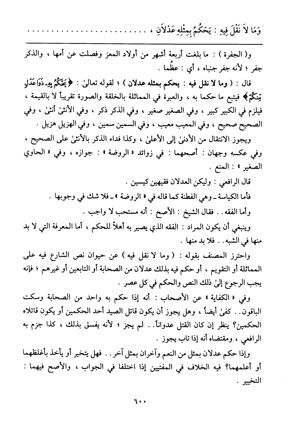 واحتزر المصنف بقوله (وما لا تقل فيه) عن حيوان نص الشارع فيه غلى المماثلة أو التقويم، او حكم فيه بذلك عدلان من الصحابة أو التابعين أو غيرهم؛ فإنه يجب الرجوع إلى ذلك النص والحكم فى كل عصر.