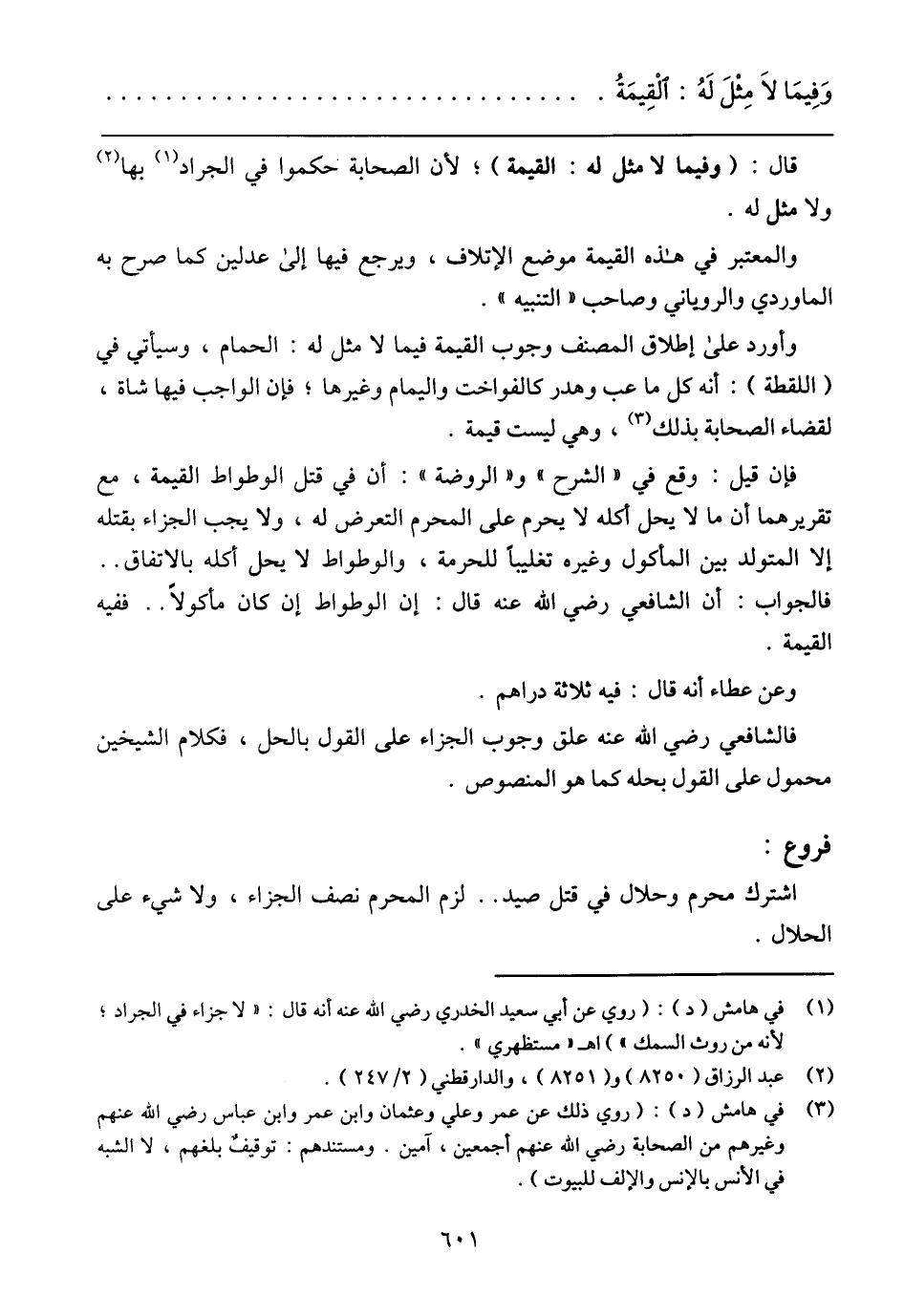 وأورد على إطلاق المصنف وجوب القيمة فيما لا مثل له: الحمام، وسيأتى فى (اللقطة): أنه كل ما عب وهدر كالفواخت واليمام وغيرها؛ فإن الواجب فيها شاة، لقضاء الصحابة بذلك، وهى ليست قيمة.