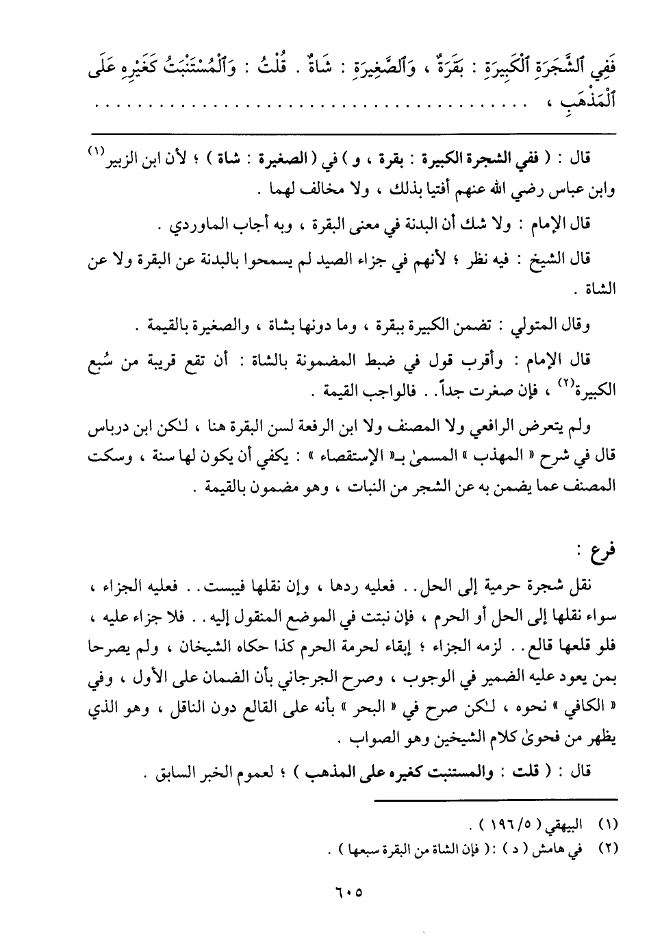 فَفِي الشَجِرَة الكَبِيرَة: بِقُرَّة، وَالصَغِيرَة: شاَة. قَلَت: وَالمُسْتَنْبَت كَغَيْرهُ عَلِيّ المُذَهَّب،