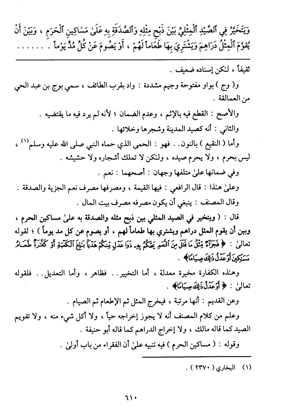 قال: (ويتخير في الصيد المثلي بين ذبح مثله والصدقة به على مساكين الحرم، وبين أن يقوم المثل دراهم ويشتري بها طعاما لهم، أو يصوم عن كل مد يومًا)؛ لقوله تعالى: {فَجَزَاءٌ مِثْلُ مَا قَتَلَ مِنَ النَّعَمِ يَحْكُمُ بِهِ ذَوَا عَدْلٍ مِنْكُمْ هَدْيًا بَالِغَ الْكَعْبَةِ أَوْ كَفَّارَةٌ طَعَامُ مَسَاكِينَ أَوْ عَدْلُ ذَلِكَ صِيَامًا}.