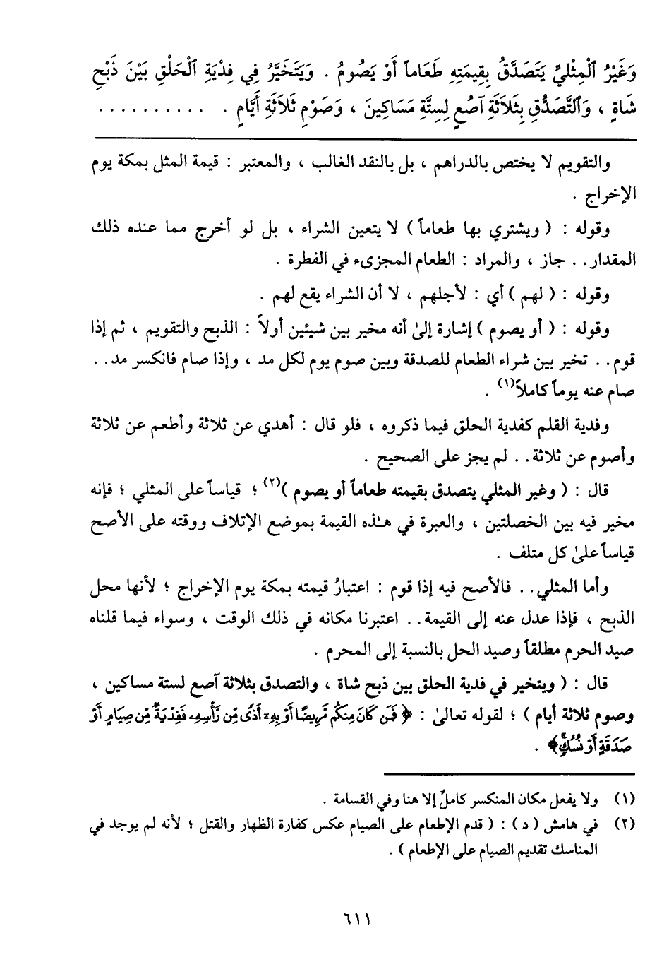 وَغَيْر المِثْلِيّ يَتَصَدَّق بِقَيِّمتهُ طَعامًا أَو يَصُوم. وَيَتَخَيَّر ِفي فِدْيَة الخَلْق بَيَّننَ ذَبَّحَ شاَة، والتصدق بِثَلاثَة آصع لَسِتَّة مَساكِين، وَصَوْم ثَلاثَة أَيّام