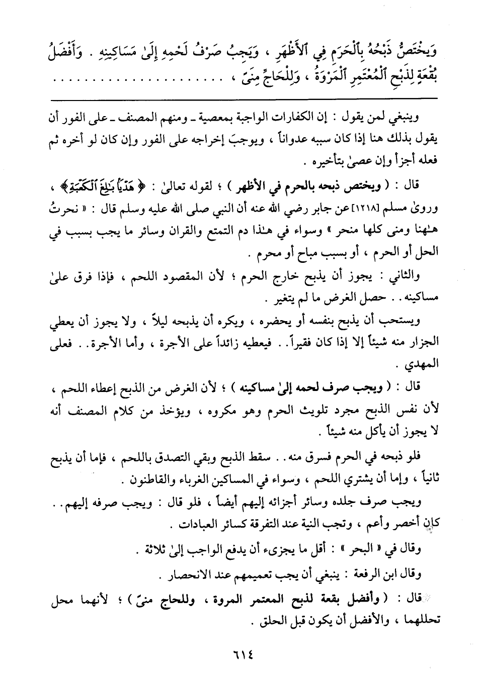 وَيَخْتَصّ ذَبْحهُ بِالحَرَم فِي الأَظْهَر، وَيَجُب صَرْف لَحِمهُ إِلَى مَساكِينهُ. وَأَفْضَل بُقْعَة لَذَبْح المعتمر المُرُوَّة، وَلِحاجّ مَنَى،