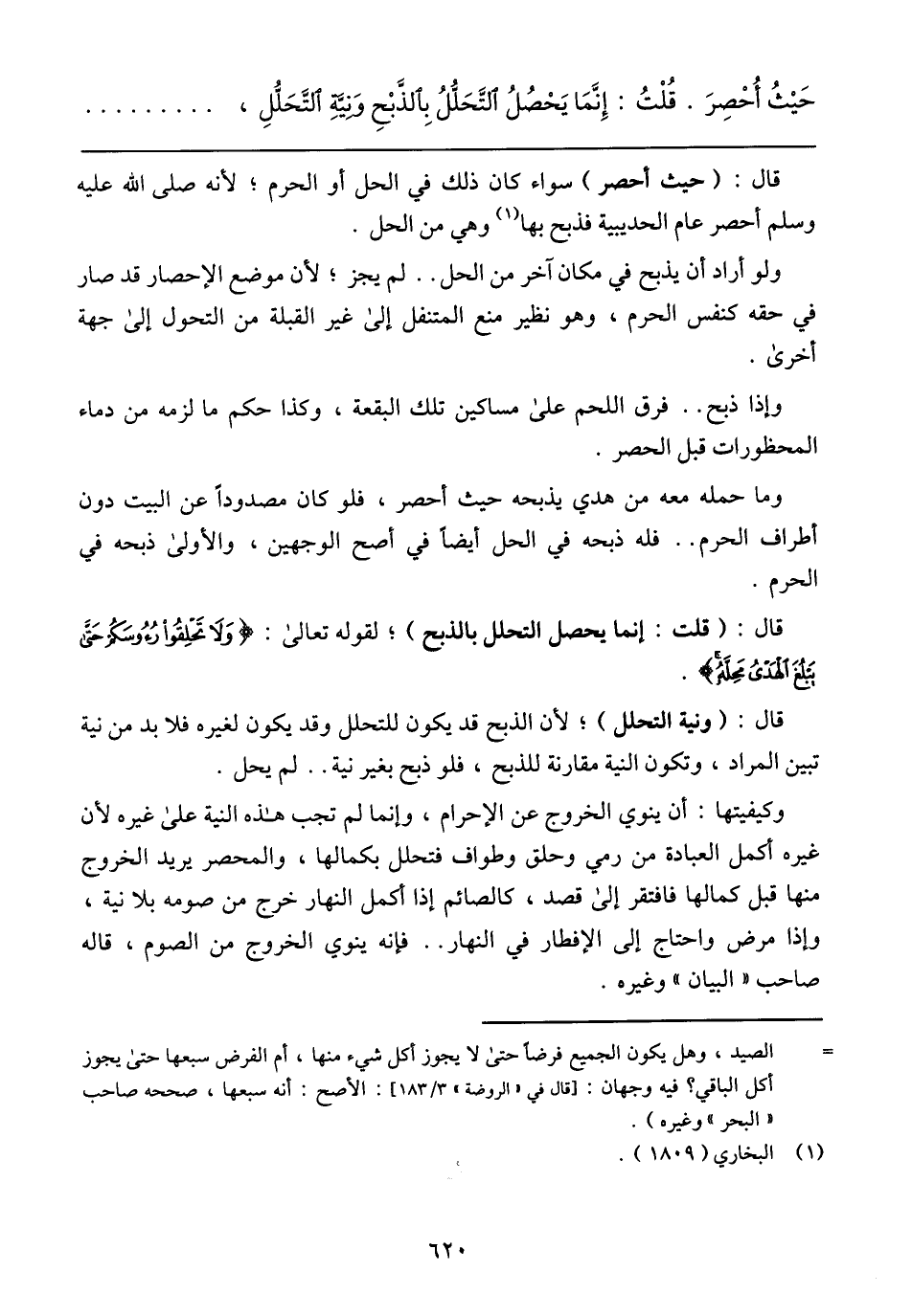 حَيْثُ أَحْصِر. قَلَت: إِنَّما يَحْصُل التَحَلُّل بِالذَبْح وَنِيَّة التَحَلُّل،