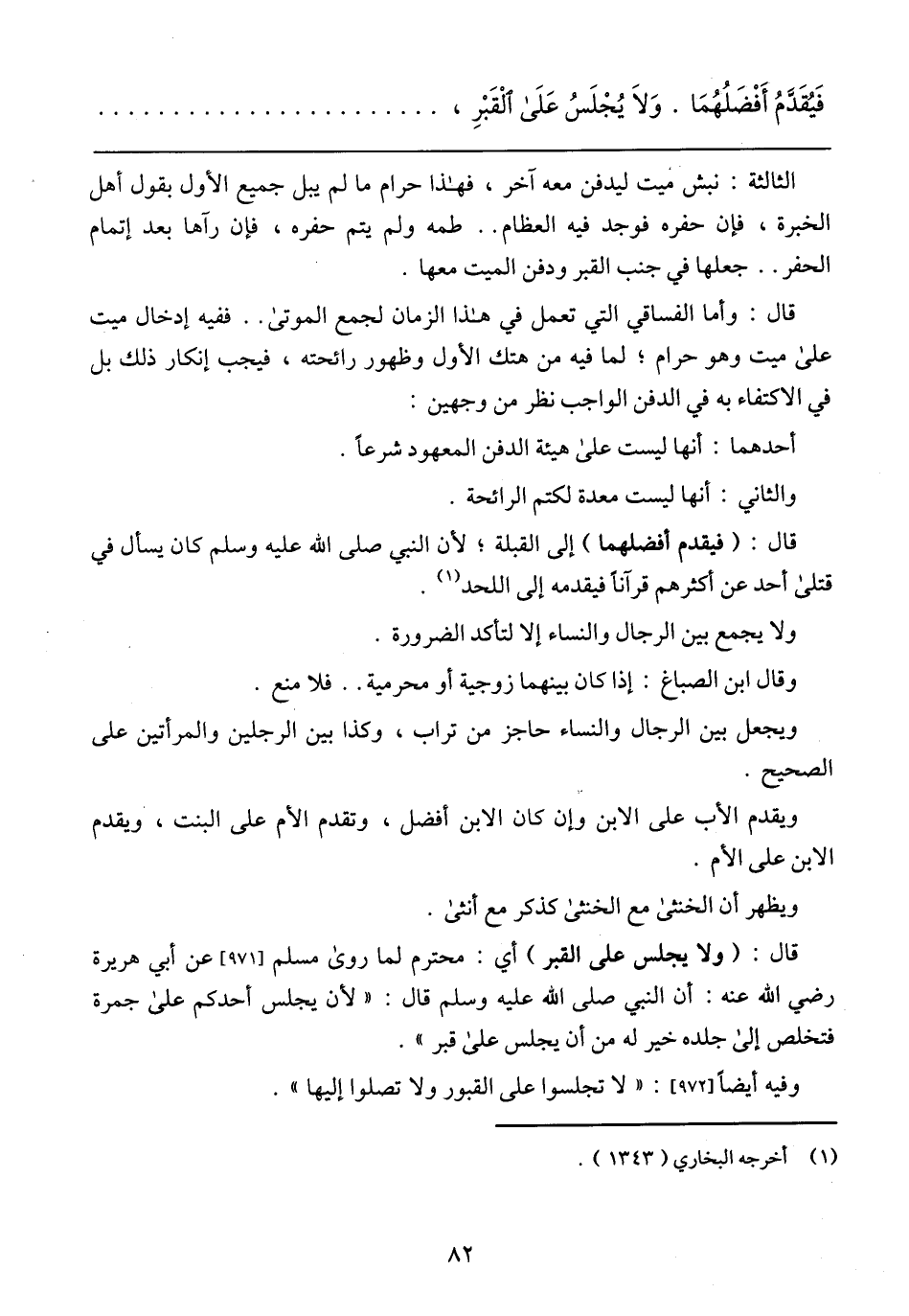 فَيُقَدِّم أُفَضِّلهُما. وَلا يُجْلَس عَلَى القَبْر،
