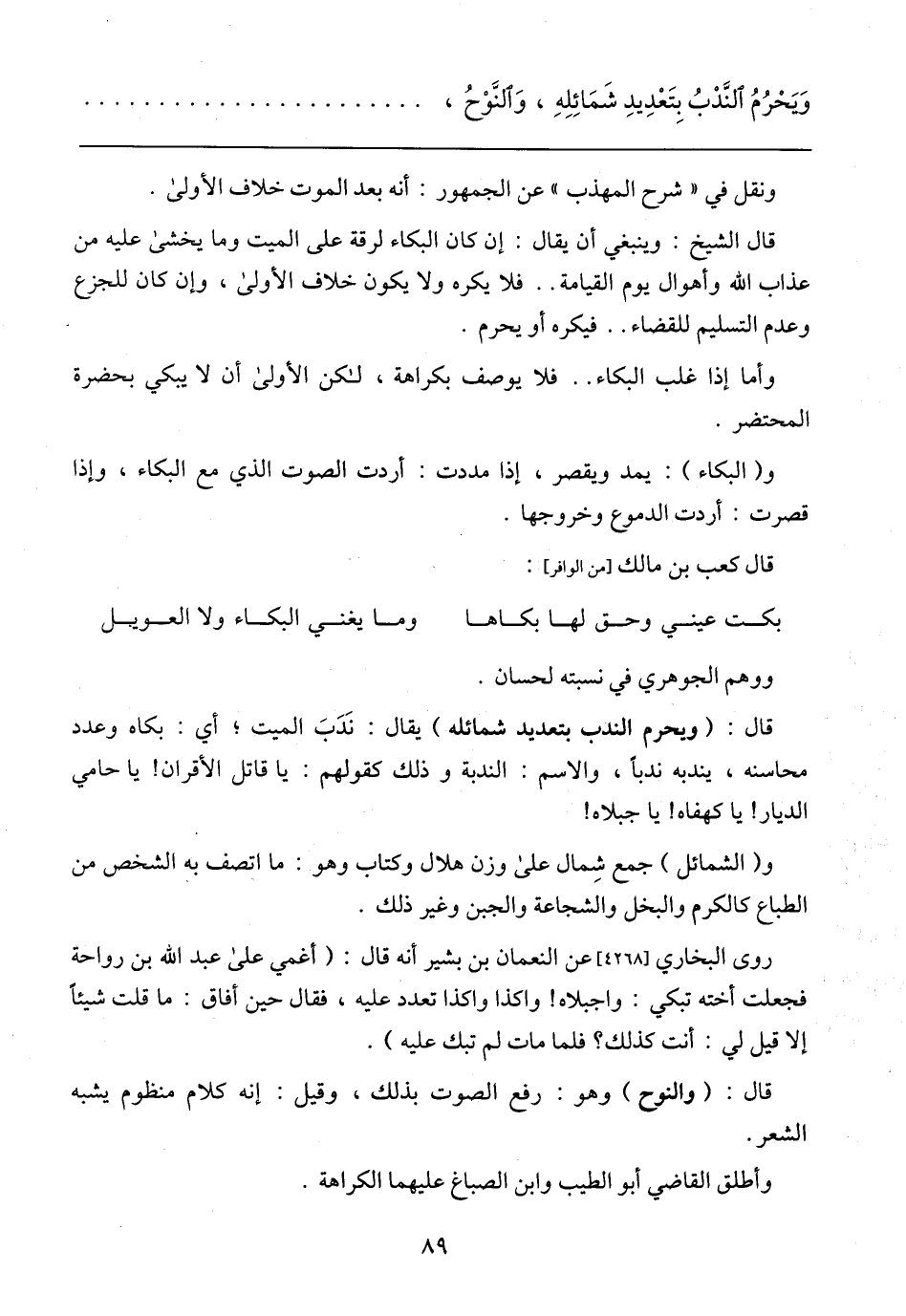 وَيَحْرِم النَدْب بِتَعْدِيد شَمائِلهُ، وَالنَوْح،