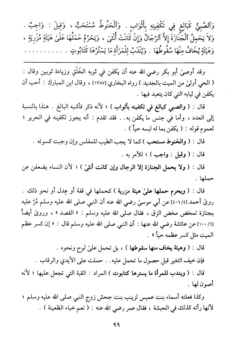وَالصَبِيّ كَبالِغ ِفي تَكْفِينَهُ بِأَثْواب. والحنوط مُسْتَحَبّ، وَقَيْل: وَأَجُبّ. وَلا يَحْمِل الجِنازَة إِلّا الرِجال وَإِنَّ كانَت أُنْثَى، وَيَحْرِم حَمَلَها عَلَى هَيْئَة مُزْرِيَة، وَهَيْئَة يُخاف مِنها شقوطها. وَيَنْدُب لِلمَرْأَة ما يُسَتِّرها كَتابُوت