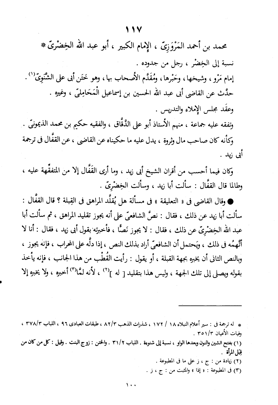117 - مُحَمَّد بن أَحْمد المروزى الإِمَام الْكَبِير أَبُو عبد الله الخضرى نِسْبَة إِلَى الْخضر رجل من جدوده