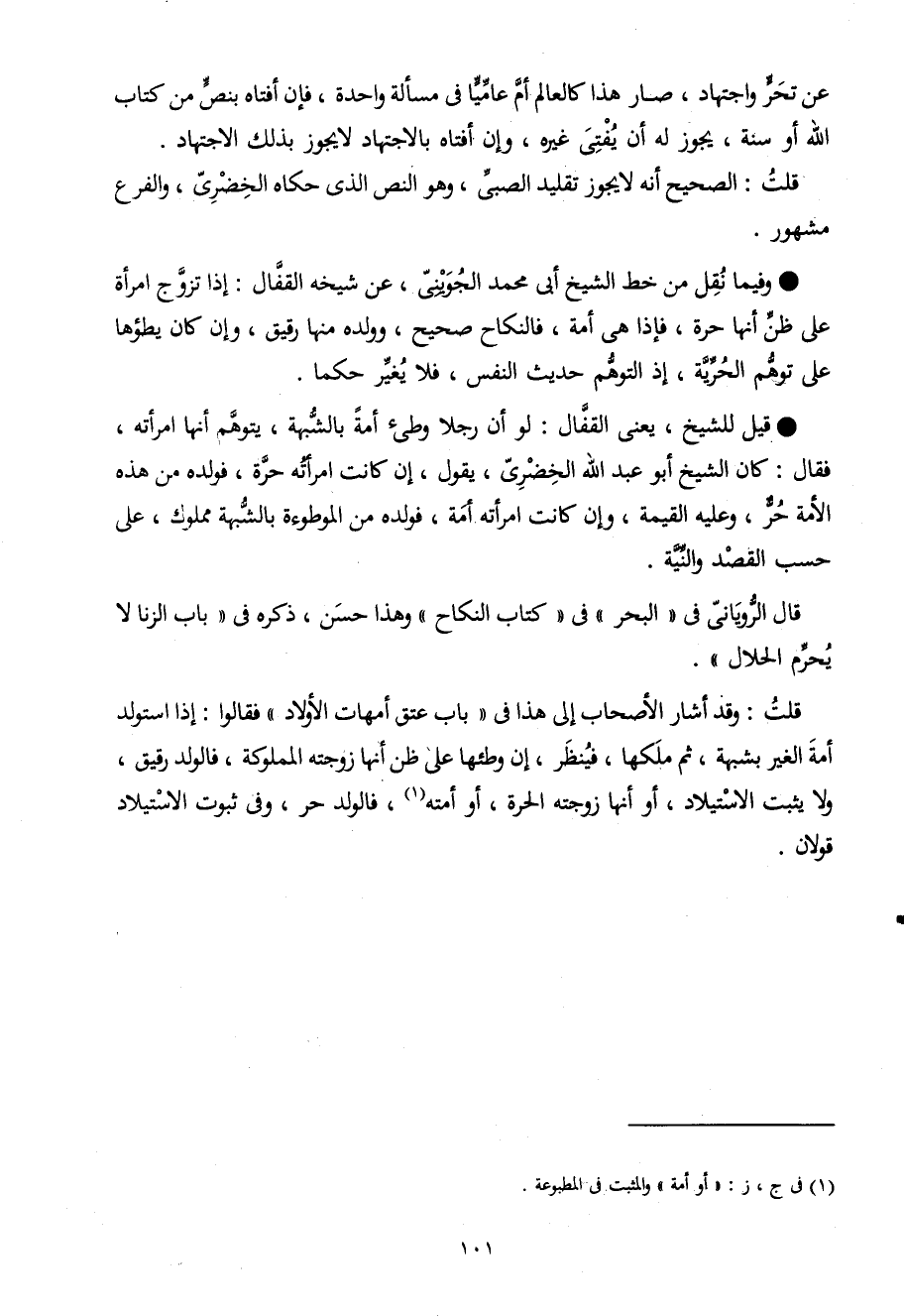 قيل للشَّيْخ يعْنى الْقفال لَو أَن رجلا وطئ أمة بِالشُّبْهَةِ يتَوَهَّم أَنَّهَا امْرَأَته فَقَالَ كَانَ الشَّيْخ أَبُو عبد الله الخضرى يَقُول إِن كَانَت امْرَأَته حرَّة فولده من هَذِه الْأمة حر وَعَلِيهِ الْقيمَة وَإِن كَانَت امْرَأَته أمة فولده من الْمَوْطُوءَة بِالشُّبْهَةِ مَمْلُوك على حسب الْقَصْد وَالنِّيَّة