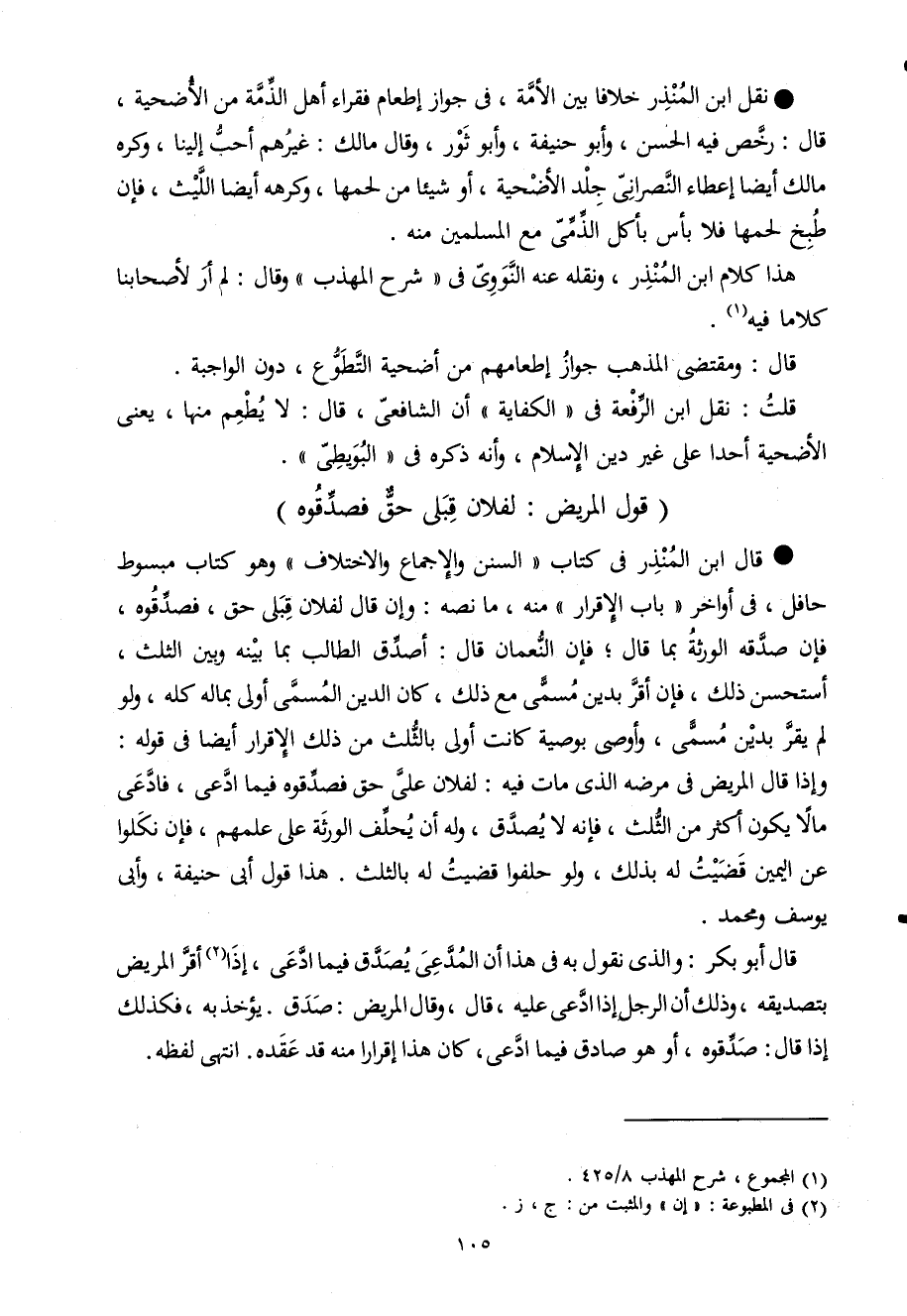 قَالَ ابْن الْمُنْذر فى كتاب السّنَن وَالْإِجْمَاع وَالِاخْتِلَاف وَهُوَ كتاب مَبْسُوط حافل فى أَوَاخِر بَاب الْإِقْرَار مِنْهُ مَا نَصه وَإِن قَالَ لفُلَان قبلى حق فصدقوه فَإِن صدقه الْوَرَثَة بِمَا قَالَ فَإِن النُّعْمَان قَالَ أصدق الطَّالِب بِمَا بَينه وَبَين الثُّلُث أستحسن ذَلِك فَإِن أقرّ بدين مُسَمّى مَعَ ذَلِك كَانَ الدّين الْمُسَمّى أولى بِمَالِه كُله وَلَو لم يقر بدين مُسَمّى وَأوصى بِوَصِيَّة كَانَت أولى بِالثُّلثِ من ذَلِك الْإِقْرَار أَيْضا فى قَوْله وَإِذا قَالَ الْمَرِيض فى مَرضه الذى مَاتَ فِيهِ لفُلَان على حق فصدقوه فِيمَا ادّعى فَادّعى مَالا يكون أَكثر من الثُّلُث فَإِنَّهُ لَا يصدق وَله أَن يحلف الْوَرَثَة على علمهمْ فَإِن نكلوا عَن الْيَمين قضيت لَهُ بذلك وَلَو حلفوا قضيت لَهُ بِالثُّلثِ هَذَا قَول أَبى حنيفَة وأبى يُوسُف وَمُحَمّد